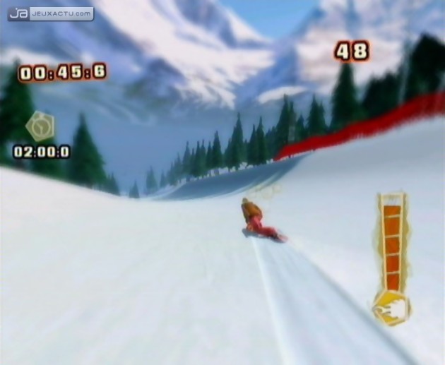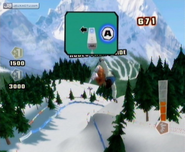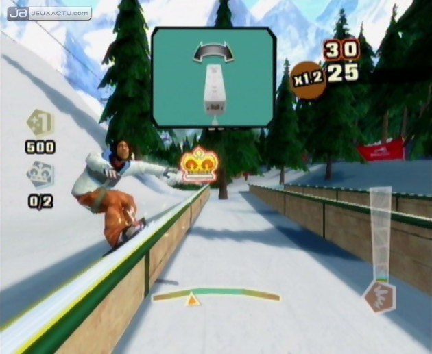 Passons au plus important : la jouabilité, en commençant par la Wiimote. Pas besoin de Nunchuk ici, seule la télécommande est utilisée. Elle symbolise tout simplement votre planche, il suffit de la tenir à l'horizontale pointée vers l'écran. En l'inclinant sur les côtés, on tourne, en la secouant un peu vers le haut, on saute (plus efficacement si on la penche légèrement vers le bas avant pour simuler l'impulsion des jambes). Le bouton A sert à se pencher pour aller plus vite, le B à prendre des virages plus serrés. Les déplacements sont très simples et franchement, on s'habitue très vite à cette prise en main très instinctive. Pour les figures, il suffit d'agiter ou d’incliner la Wiimote dans certaines directions en maintenant A, B ou les deux à la fois lors des sauts. Mais attention, pour valider les points, il faut veiller à bien atterrir pour ne pas tomber ! Pour cela, vous devez incliner la télécommande afin d'aligner la planche avec la piste, avec l'espoir de gagner un bonus de 10% si votre plaquage au sol est parfait. Après un très léger temps d'adaptation, on arrive à faire à peu près ce que l'on veut même si on ne peut éviter certaines imprécisions jamais bien méchantes. Reste que c'est très fun et que cette jouabilité procure d'excellentes sensations. Contrairement à ce qu'on pourrait penser, ça ne fait pas mal au poignet (à moins de jouer 3 heures de suite évidemment !). A ce niveau-là, on peut donc déjà dire que Shaun White Snowboarding : Road Trip est une réussite, mais il existe une autre façon d'y jouer...