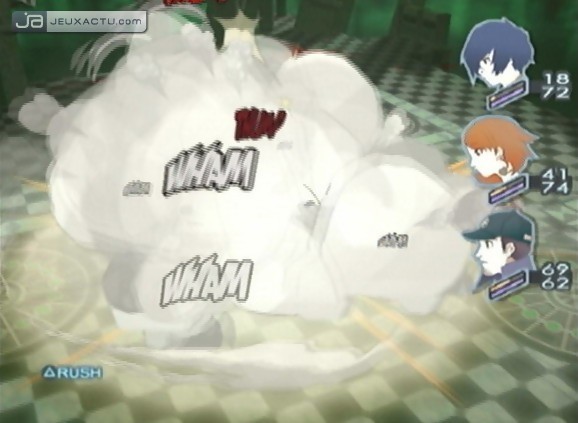 Bien que cette phase essentiellement basée sur un jeu de questions/réponses soit véritablement prenante, voire absorbante, n’oublions pas que le but du jeu n’est pas de se rendre le plus populaire ou le plus intelligent possible, mais bien de faire la lumière sur l’existence des Shadows. L’arrivée du Dark Hour, coïncide donc avec l’arrivée de cette tour, qu’il faudra gravir à son rythme. A l’instar de la vie d’étudiant, il est possible ici aussi de progresser selon son envie, sans nécessairement passer par un engloutissement boulimique des kilomètres de couloirs et d’étages générés aléatoirement. De toute manière, cette approche n’est possible que dans un premier temps, puisque des barrières se poseront parfois devant vous, en attente des fins de chapitre marquées par les soirs de pleine lune, où une quête spécial attendra les membres du SEES. En attendant, il est sera toujours possible de se refaire les étages à l’envie, histoire de dénicher toujours plus d’objet. D’ailleurs, pour rendre la tâche moins lourde, Atlus a eu la bonne idée de donner la possibilité de séparer son groupe afin de gagner du temps en laissant chacun des membres de son équipe farfouiller de son côté. Cela dit, il faudra constamment veiller sur leur barre de vie, sous peine de repartir avec un cadavre sous le bras. Ce système les obligeants à combattre seul dans une sorte de mêlée au style cartoon, même si le héros et d’autres compagnons sont susceptibles de rejoindre la bataille.
