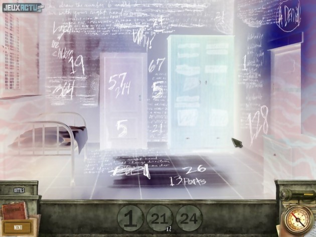 L'essentiel du gameplay repose en réalité sur le concept d'objets cachés. Chaque scène est constellée de plusieurs dizaines d'objets et il suffit de cliquer sur ceux que le marshall Daniels recherche pour débloquer l'action et faire avancer le scénario. Les variations de taille, les superpositions ou encore le positionnement sur des fonds de couleur proche amplifient la dissimulation mais ne suffisent jamais à rendre la tâche insurmontable. Ce principe basique, voire enfantin, n'est pas foncièrement désagréable mais finit rapidement par lasser. Les développeurs ont bien tenté d'injecter un peu de variété en nous demandant par moments de retrouver des nombres dissimulés dans le décor (sous le prétexte que les schizophrènes de l'établissement psychiatrique "traduisent les nombres et les symboles en codes pour les aider à maintenir leurs délires"), en représentant les scènes de cauchemar du héros par un passage de l'image en négatif qui complique légèrement la recherche, ou encore en alternant une présentation visuelle avec une description nominative des objets à retrouver. On nous demande même à un moment de deviner la nature des objets à partir d'une définition élusive et poétique, à la manière d'une énigme orientale. Mais cette idée n'est hélas pas assez exploitée. De même, le jeu se dote de quelques casse-têtes que ne renierait pas le professeur Layon (cinq exactement) mais ils sont toujours très simples (engrenages, fils emmêlés, calcul, serrure, jeu des différences) et, surtout, s'avèrent en réalité totalement facultatifs. Si vous passez un peu trop de temps à tenter de les résoudre, une option "passer le mini-jeu" apparaît et son utilisation n'entraîne strictement aucune pénalité. Plus casual, tu meurs ! Dans le même ordre d'idées, une lampe-torche qui se recharge en quelques dizaines de secondes vous permettra de mettre en lumière la position d'un objet trop bien caché que vous n'auriez pas réussi à dénicher. Et le pseudo-inventaire que nous évoquions dans le chapitre précédent ne sert qu'au stockage automatique d'objets à déposer quelques secondes plus tard sur une zone interactive bien déterminée et indiquée de manière très voyante (linéarité maximum garantie). Conséquence de cette absence totale de challenge : un joueur aguerri mettra moins de deux heures à boucler l'aventure !