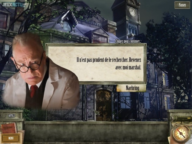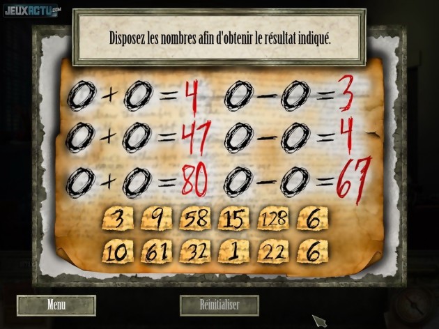 L'essentiel du gameplay repose en réalité sur le concept d'objets cachés. Chaque scène est constellée de plusieurs dizaines d'objets et il suffit de cliquer sur ceux que le marshall Daniels recherche pour débloquer l'action et faire avancer le scénario. Les variations de taille, les superpositions ou encore le positionnement sur des fonds de couleur proche amplifient la dissimulation mais ne suffisent jamais à rendre la tâche insurmontable. Ce principe basique, voire enfantin, n'est pas foncièrement désagréable mais finit rapidement par lasser. Les développeurs ont bien tenté d'injecter un peu de variété en nous demandant par moments de retrouver des nombres dissimulés dans le décor (sous le prétexte que les schizophrènes de l'établissement psychiatrique "traduisent les nombres et les symboles en codes pour les aider à maintenir leurs délires"), en représentant les scènes de cauchemar du héros par un passage de l'image en négatif qui complique légèrement la recherche, ou encore en alternant une présentation visuelle avec une description nominative des objets à retrouver. On nous demande même à un moment de deviner la nature des objets à partir d'une définition élusive et poétique, à la manière d'une énigme orientale. Mais cette idée n'est hélas pas assez exploitée. De même, le jeu se dote de quelques casse-têtes que ne renierait pas le professeur Layon (cinq exactement) mais ils sont toujours très simples (engrenages, fils emmêlés, calcul, serrure, jeu des différences) et, surtout, s'avèrent en réalité totalement facultatifs. Si vous passez un peu trop de temps à tenter de les résoudre, une option "passer le mini-jeu" apparaît et son utilisation n'entraîne strictement aucune pénalité. Plus casual, tu meurs ! Dans le même ordre d'idées, une lampe-torche qui se recharge en quelques dizaines de secondes vous permettra de mettre en lumière la position d'un objet trop bien caché que vous n'auriez pas réussi à dénicher. Et le pseudo-inventaire que nous évoquions dans le chapitre précédent ne sert qu'au stockage automatique d'objets à déposer quelques secondes plus tard sur une zone interactive bien déterminée et indiquée de manière très voyante (linéarité maximum garantie). Conséquence de cette absence totale de challenge : un joueur aguerri mettra moins de deux heures à boucler l'aventure !