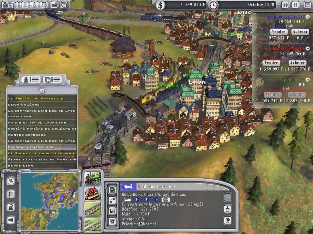En premier lieu, il faut rapidement analyser le jeu de l’offre et de la demande, quels sont les besoins des villes, les matières premières et les éventuels ateliers de production. Généralement, on commence par transporter dans un premier temps du courrier et des passagers, puis on s’oriente rapidement vers le transport de frets, beaucoup plus lucratif. Certaines matières premières nécessitent parfois d’être transformées et le transport des voyageurs/courriers devant être le plus rapide possible pour amasser plus d’argent. Il faut donc penser à bien optimiser le réseau et le nombre de wagons constituant chaque voyage. Au fur à mesure qu’une ville s’agrandit, elle a de nouveaux besoins et dispose éventuellement de nouveaux ateliers de production. Pour se faciliter la tâche, on peut également construire le bâtiment de son choix mais il faut y mettre le prix. On peut également acheter aux enchères un édifice déjà existant et profiter de ses résultats économiques, une manière de rentabiliser une route commerciale. Pour attirer le chemin de fer, certaines villes proposent ponctuellement des défis et le premier à le réaliser gagne une somme d’argent substantielle. Mais globalement, jouer les minutieux et se perdre dans le micro-management est finalement inutile puisque l’argent rentre très rapidement dans les caisses avec un effort minime. Pour se démarquer de la concurrence, on pourra tenter de se procurer l’exclusivité des brevets d’invention aux enchères. Proposés ponctuellement, ces derniers disposent généralement de bonus non négligeables et sont valables durant une dizaine d’années avant de tomber dans le domaine public. En progressant dans le temps, de nouvelles locomotives plus perfectionnées seront disponibles pour tous les joueurs. Ils sont généralement le signal de départ pour renouveler un parc de machines vieillissantes. Un investissement lourd qu’il ne faut pas hésiter à faire car le coût de maintenance d’une locomotive augmente proportionnellement à son âge.