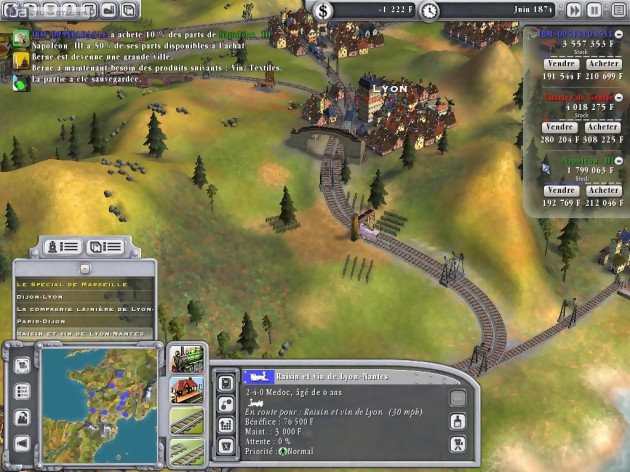 Cerise sur le cake, Sid Meier's Railroads! n’offre aucun mode campagne. Tout juste a-t-on droit à un peu moins d’une dizaine de cartes (Etats-Unis, Angleterre, France, etc.) et autant de scénarios aux objectifs des plus limités : relier une ville à l’autre, livrer telle quantité de chargement d’un point à un autre, etc. Plusieurs paramètres sont sélectionnables comme le niveau de difficulté ou même le nombre de concurrents. On peut même décider de jouer tout seul. Bref, le contenu est donc assez maigre et l’absence d’éditeurs de carte n’arrange pas vraiment les choses. Le principal intérêt de la chose est d’éliminer ses concurrents et d’être le seul maître à bord. Pour cela, une seule solution : la Bourse. On dispose seulement de 10% du capital de son entreprise au départ et on peut progressivement racheter des actions pour en faire monter la valeur et se protéger de toutes OPA hostiles. Vos concurrents peuvent également spéculer sur votre entreprise et si vous souhaitez récupérer vos actions, il faudra aligner le double de leur valeur. Mieux vaut donc investir rapidement. Même chose concernant vos adversaires puisqu’il vous faudra grignoter leurs parts jusqu’à obtenir 100% pour les sortir de la course et s’approprier leurs biens.