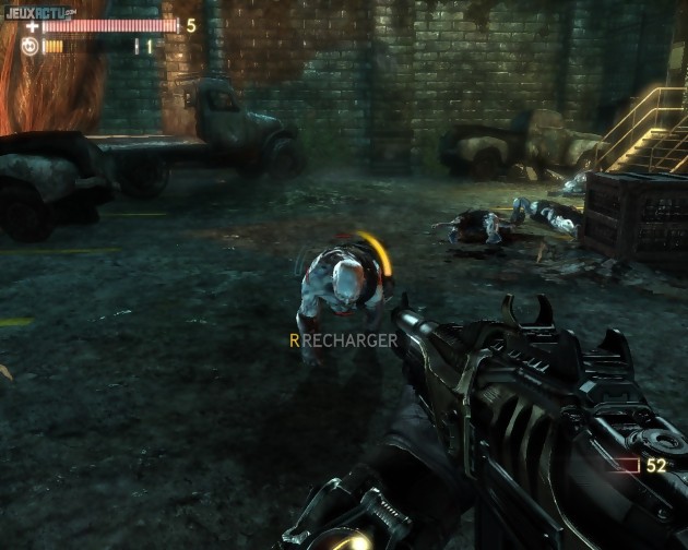 Ce genre d'interactions est hélas limité aux objets ayant été marqués à l'E99 (comprenez : aux objets choisis par avance par les développeurs), et ils ne sont pas bien nombreux. En revanche, on n'hésitera pas à faire usage du MT sur un maximum de soldats, qui vieillissent alors instantanément et se retrouvent transformés en squelettes bien inoffensifs. En ajoutant à cela un arsenal plutôt bien fourni et améliorable sur plusieurs niveaux (dégâts de chaque arme, capacités du chargeur, vitesse de rechargement), on obtient de multiples manières de se débarrasser des adversaires. De quoi s'amuser très honnêtement, mais hélas pendant peu de temps puisqu'il faut environ sept ou huit heures pour terminer la campagne solo. Un joueur pressé, qui ne prendrait pas la peine d'explorer les lieux et de s'intéresser aux messages audio et vidéo laissés à son attention, pourra même certainement se gâcher son plaisir en cinq petites heures. La version PC souffre par ailleurs d'un bug qu'on espère voir corrigé bientôt : parfois, le chargement de textures ne se fait pas assez rapidement et l'on peut observer des surfaces très peu détaillées. Un problème de l'Unreal Engine 3 déjà aperçu dans Bioshock ou Unreal Tournament III, mais qui ne durait alors qu'une ou deux secondes. Ici, il peut se passer plusieurs minutes pendant lesquelles on évolue dans des décors sérieusement dégradés. Pas de quoi se formaliser outre mesure tout de même, car ce n'est pas systématique et dans le feu de l'action on n'y fait pas toujours attention. Terminons par un mot sur le mode multijoueur, qui oppose une équipe de soldats à une équipe de créatures mutantes. Ces dernières évoluent en vue à la troisième personne, ce qui apporte un peu de renouveau au gameplay. Mais du succès commercial du jeu dépendra l'intérêt de ce mode multi. Sans personne à affronter, à quoi bon guerroyer ?