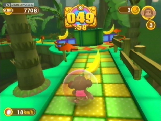 Découpé en 8 mondes différents, répartis en 10 niveaux chacun, la partie solo de Super Monkey Ball : Banana Blitz se distingue essentiellement par la présence de Boss à éliminer en fin de parcours. C’est assez inattendu mais plutôt bien pensé pour conclure avec brio la fin de chacun des chapitres. Cracoucass géant, pieuvre métallique, gorille mécontent, dinosaure mécanique, chacun d’entre eux dispose d’un point faible pas bien difficile à repérer. Assez faciles à abattre, ce ne sont pas ces Boss qui donnent le plus de fil à retordre mais bel et bien les différents parcours qui mènent à eux qui proposent un challenge de taille. Fidèle à sa réputation, Super Monkey Ball : Banana Blitz ne déroge pas à la règle et propose un certain nombre de parcours qu’on s’amusera à répéter à plusieurs reprises avant de pouvoir franchir tranquillement la porte arc-en-ciel, synonyme de réussite. Parmi les petites nouveautés notables, Super Monkey Ball : Banana Blitz introduit de nouveaux singes. Si AiAi, GonGon et MeeMee sont des personnages que l’on commence à connaître sur le bout des doigts, il va falloir accueillir comme il se doit l’arrivée de YanYan, petite femelle avec des couettes et de Doctor, atteint de somnolence chronique.