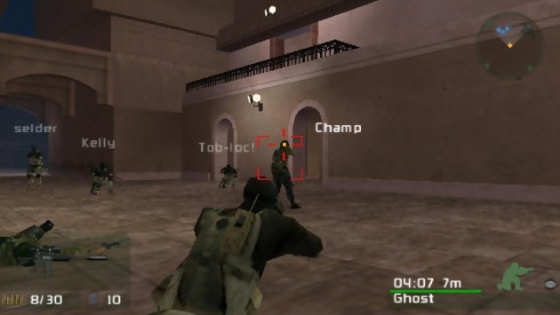 Moins complet, moins tactique et moins riche, Fireteam Bravo n’est pas pour autant un titre à négliger, tant et si bien qu’il offre 14 missions parfaitement inédites, au sein de quatre opérations qui vous feront voyager du Chili à la Pologne en passant par le Maroc et le continent Sud-Asiatique. Très faciles au début, les objectifs se corsent en même temps que les terroristes s’invitent plus nombreux à partir de la mission 9. Dans tous les cas, la difficulté est paramétrable. Si Fireteam Bravo n’est pas aussi riche qu’un SOCOM 3, sa prise en main n’en nécessite pas moins de passer par un tutorial assez riche dont les principaux chapitres sont les déplacements, la gestion des armes et enfin le panel de communication. En ce qui concerne les déplacements, ils ne souffrent nullement de l’absence d’un second stick analogique, la gâchette L servant à straffer et la visée est désormais assistée ! Le lock via la gachette R, c’est en effet ce qui modifie profondément le gameplay de cette version portative de SOCOM. Le réticule de visée nous informe de la provenance des tirs en cas d’échauffourée, permettant de locker frénétiquement dans la direction concernée jusqu’à ce qu’on puisse localiser l’ennemi le plus proche et ne plus le lâcher un seul instant. Bien entendu, il reste possible de progresser à la première personne, ainsi que de permuter en vue interne pour sniper comme il se doit. Soyons clair, le gameplay de Fireteam Bravo est propice au bourrinage, mais le peu d’énergie vitale contenu dans notre militaire américain, l’absence de remèdes sur le terrain, et le game over immédiat en cas de décès, sans la possibilité de sauvegarder en cours de mission, sont autant d’éléments dissuadant de foncer comme une brute. Se retaper depuis le tout début une longue mission à la moindre erreur, comme se faire surprendre de dos par une rafale de AK47, n’est pas des plus amusants. Il en résulte donc une sorte de juste milieu entre le FPS bourrin et tactique. La gestion des armes s’effectue avec un menu déroulant accessible via la croix de directions, c’est donc également par le biais de ce menu que l’on accède à l’appareil photo, les jumelles ou encore les grenades. Enfin, une pression sur le bouton rond fait apparaître le panel d’action et de communication. Animal peu solitaire, le SEAL ne sors jamais sans ses amis. Sur PSP, c’est un couple de militaire qui opère de concert. Votre ami LONESTAR, dont la mort équivaut à la vôtre, c’est à dire à la fin pure et simple de la mission, peut effectuer autant d’actions que vous, y compris ouvrir une porte violemment, et jeter une grenade aveuglante dans la pièce. A noter cependant que le mode solo n’inclut pas la reconnaissance vocale du casque-micro. C’est donc au cœur du mode Infrastructure (jeu en ligne) que l’on va pouvoir se la jouer pleinement commando au cœur de l’action.