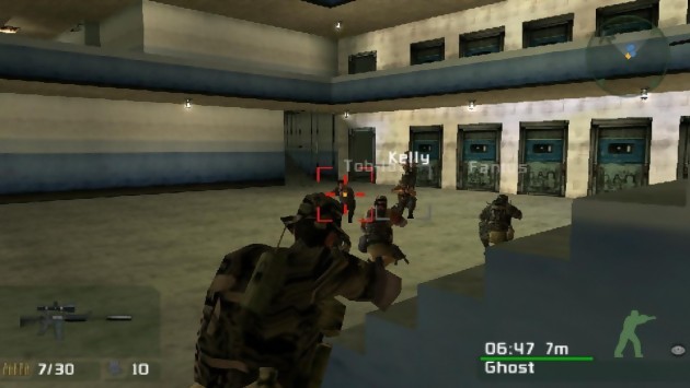 Après une mise en ligne super rapide, on découvre la liste des serveurs, et pas de doutes, on est bien sur SOCOM. Des Anglais, des Allemands, des Espagnols mais surtout des tas de Français répondent à l’appel de ce populaire jeu en ligne, moins d’un mois après la sortie du jeu sur une console dont le parc est pourtant très loin de celui de sa version de salon. Toujours est-il que Fireteam Bravo reproduit le schéma communautaire de la PlayStation 2 avec des tas de joueurs fidèles qui se regroupent naturellement en une multitude de clans. Et si la communication via le clavier (toujours virtuel à l’heure actuelle) est lésée, il reste le casque-micro livré avec le jeu. L’efficacité de son fonctionnement est aléatoire et donc plus ou moins audible, mais si le dieu du débit est avec vous, le résultat sonore sera limpide. En tout cas, pendant la partie, seuls les membres d’une même équipe sont autorisés à communiquer, pour ne pas trahir des stratégies orales, le sel d’une partie de SOCOM en ligne. Elaborer ses tactiques de vive voix avec des partenaires du monde entier, c’est chose courante sur console depuis des années, mais nouveau dans le cadre du online sur portable ! Cette version PSP se la joue d’ailleurs grande classe en accueillant jusqu’à 16 joueurs, le tout avec très peu de problèmes techniques pendant nos tests, même si là encore tout peut dépendre de l’amabilité de votre connexion et de celles de vos partenaires. Les parties s’enchaînent donc agréablement, même si finalement, SOCOM PSP n’est sans doutes pas le jeu multi le plus jouissif qui puisse exister, étant donné que son gameplay mi-figue mi-raisin hésite entre technicité et assistance. On regrettera enfin un élément, dérisoire en solo mais qui risque de plomber pas mal de parties en ligne : la trop grande efficacité des grenades dont le souffle décime une troupe de SEALS bien trop facilement. Connaissant la capacité des joueurs sans scrupules à insister sur ce genre de déséquilibres, vous savez à quoi vous en tenir.