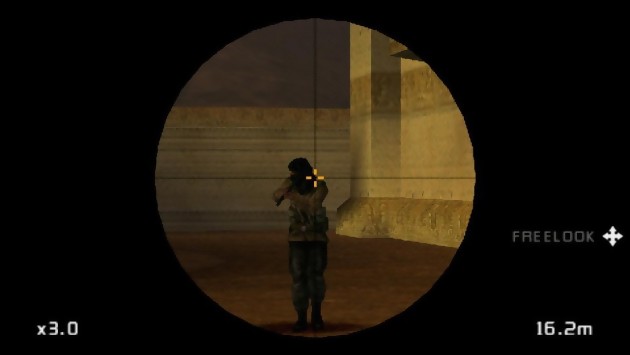 Moins complet, moins tactique et moins riche, Fireteam Bravo n’est pas pour autant un titre à négliger, tant et si bien qu’il offre 14 missions parfaitement inédites, au sein de quatre opérations qui vous feront voyager du Chili à la Pologne en passant par le Maroc et le continent Sud-Asiatique. Très faciles au début, les objectifs se corsent en même temps que les terroristes s’invitent plus nombreux à partir de la mission 9. Dans tous les cas, la difficulté est paramétrable. Si Fireteam Bravo n’est pas aussi riche qu’un SOCOM 3, sa prise en main n’en nécessite pas moins de passer par un tutorial assez riche dont les principaux chapitres sont les déplacements, la gestion des armes et enfin le panel de communication. En ce qui concerne les déplacements, ils ne souffrent nullement de l’absence d’un second stick analogique, la gâchette L servant à straffer et la visée est désormais assistée ! Le lock via la gachette R, c’est en effet ce qui modifie profondément le gameplay de cette version portative de SOCOM. Le réticule de visée nous informe de la provenance des tirs en cas d’échauffourée, permettant de locker frénétiquement dans la direction concernée jusqu’à ce qu’on puisse localiser l’ennemi le plus proche et ne plus le lâcher un seul instant. Bien entendu, il reste possible de progresser à la première personne, ainsi que de permuter en vue interne pour sniper comme il se doit. Soyons clair, le gameplay de Fireteam Bravo est propice au bourrinage, mais le peu d’énergie vitale contenu dans notre militaire américain, l’absence de remèdes sur le terrain, et le game over immédiat en cas de décès, sans la possibilité de sauvegarder en cours de mission, sont autant d’éléments dissuadant de foncer comme une brute. Se retaper depuis le tout début une longue mission à la moindre erreur, comme se faire surprendre de dos par une rafale de AK47, n’est pas des plus amusants. Il en résulte donc une sorte de juste milieu entre le FPS bourrin et tactique. La gestion des armes s’effectue avec un menu déroulant accessible via la croix de directions, c’est donc également par le biais de ce menu que l’on accède à l’appareil photo, les jumelles ou encore les grenades. Enfin, une pression sur le bouton rond fait apparaître le panel d’action et de communication. Animal peu solitaire, le SEAL ne sors jamais sans ses amis. Sur PSP, c’est un couple de militaire qui opère de concert. Votre ami LONESTAR, dont la mort équivaut à la vôtre, c’est à dire à la fin pure et simple de la mission, peut effectuer autant d’actions que vous, y compris ouvrir une porte violemment, et jeter une grenade aveuglante dans la pièce. A noter cependant que le mode solo n’inclut pas la reconnaissance vocale du casque-micro. C’est donc au cœur du mode Infrastructure (jeu en ligne) que l’on va pouvoir se la jouer pleinement commando au cœur de l’action.