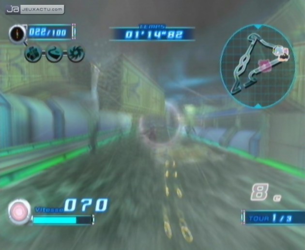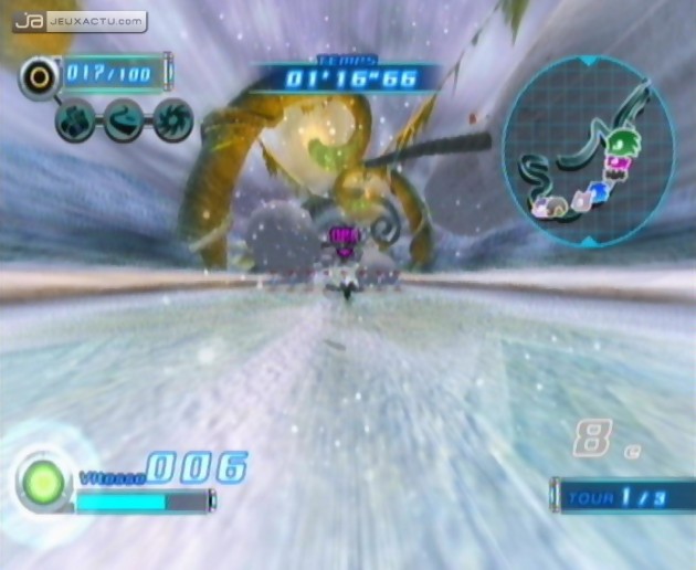 Sans être forcément technique, Sonic Riders : Zero Gravity se base néanmoins sur certains mouvements spéciaux qui permettent de ne pas finir à la dernière place. On pense notamment au Contrôle de gravité, indispensable pour aborder à grande vitesse les virages à angle droit, et à l'Elan céleste qui, en percutant les obstacles placés sur la piste, augmente considérablement la vitesse de pointe de la planche. Sonic Riders : Riders Gravity tente aussi de faire dans la subtilité, en différenciant les pilotes selon des critères - direction, accélération, puissance... (qui jouent un rôle secondaire dans l'attribution de la victoire. Même les items - accélérateur, champ magnétique, ralentisseur, explosion...) ne marqueront pas les esprits comme peut le faire un Mario Kart. Et puisqu'il faut bien parler de l'aspect visuel du jeu, elle se contente du minimum syndical, sans doute un peu plus détaillée que le premier opus, mais on demeure dans du scolaire. Les quelques flocons de neige et les gouttes de pluie qui viennent s'écraser contre l'objectif n'ajoutent pas réellement de charme à Sonic Riders : Zero Gravity.