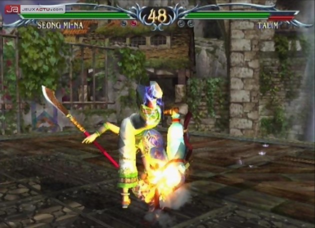 Car celle que nous n'allons plus vous cacher longtemps concerne la prestation graphique de la Playstation 2 qui est ENORME ! Faute avouée à moitié pardonnée : nous avons été nombreux à casser du sucre sur le dos de le monolithe de Sony lorsque fut annoncé de façon officielle que Soul Calibur III lui appartiendrait de façon exclusive. Développer une sequel sur la console qui a le moins fait honneur à Soul Calibur II ressemblait à un arrêt de mort de la série. Couleurs fades, aliasing omniprésent, ralentissements à gogo, voilà les principaux défauts relevés chez le prédécesseur quand il tournait là-bas. La démo de Soul Calibur III ne faisait pas trop d'efforts pour nous rassurer, même s'il y avait du mieux. Tous ces doutes, toutes ces craintes sont gommés une fois la galette du jeu ingurgitée par le tiroir, et le premier combat engagé. Comme prévu, le character design n'a pas trop évolué, juste un peaufinage pour pas que le spectacle prenne un air de déjà vu. L'animation des protagonistes est toujours aussi fluide, et les poses victorieuses des combattants pointent toujours à chaque fin de versus. Certains costumes ont également de la gueule comme Kilik en col mao, ou bien Maxi et ses cheveux blancs. Les rageux remarqueront même que certains personnages ont évolué physiquement : Kilik adopte un faciès plus mature, et Taki semble avoir pris du poids (si, si !). Pour ce qui est des guerriers personnalisés, la qualité visuelle est moindre, mais le décalage n'est pas profond.