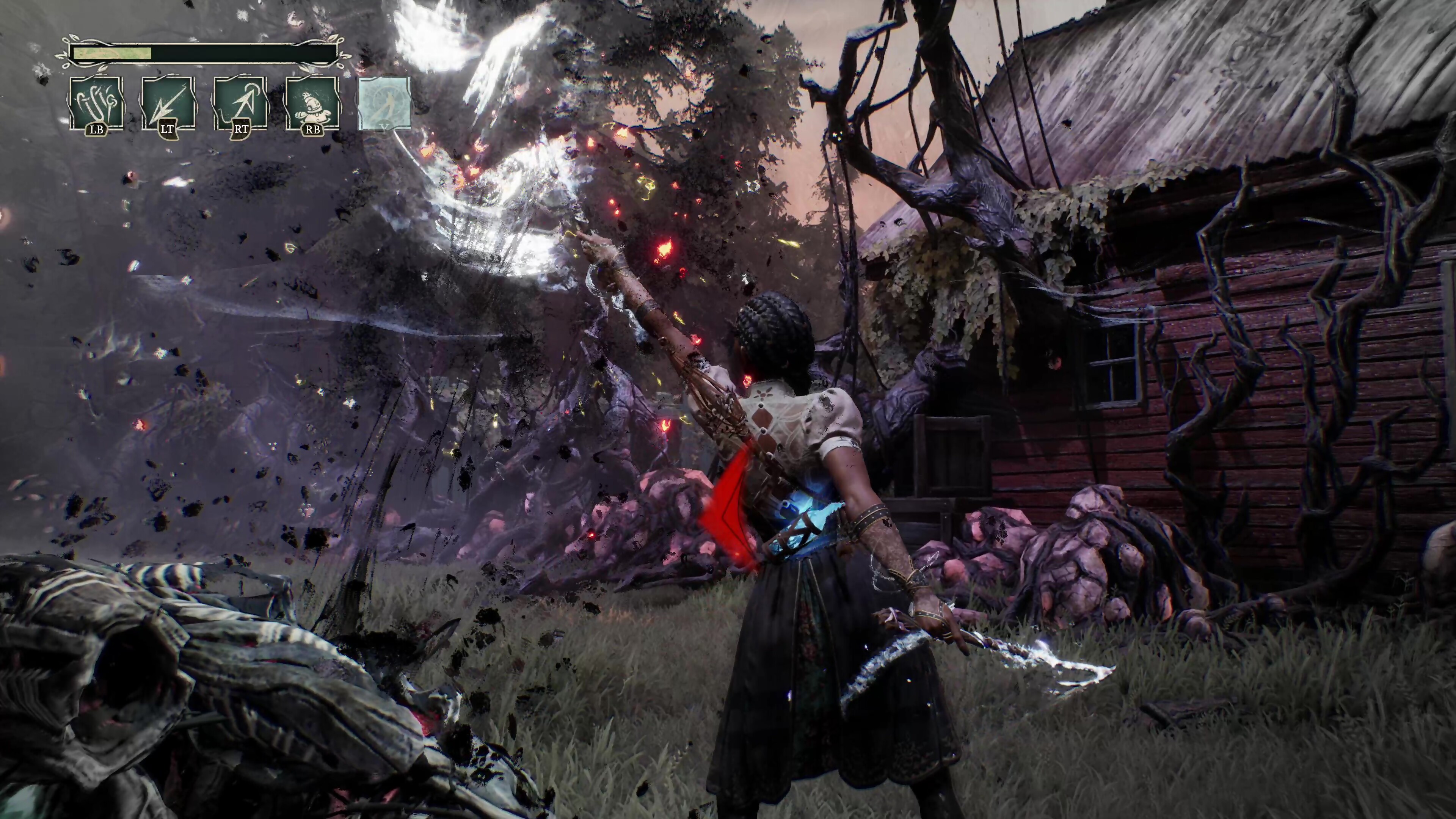 Si les compétences et les pouvoirs d’Hazel se débloquent au fil de l’aventure, très vite, on se rend compte que chaque niveau sont construits systématiquement de la même manière, d’autant que les combats ont lieu invariablement dans des zones fermées, sur les côtés du chemin qu’on suit presque aveuglément et qui sont en plus délimitées par des séquelles, ces barrières végétales qui font office de murs invisibles. D’ailleurs, pour que les ennemis apparaissent, il faut obligatoirement entrer dans ces zones, sinon jamais vous ne croiserez de menace sur votre parcours, si ce n’est des champignons explosifs qu’on repère sans le moindre problème, puisqu’ils se mettent à s’agiter et à briller également. De toutes les manières, South of Midnight ne vous posera rarement de problème, le jeu étant très accessible et les séquences de plateformes ont été également très simplifiées, d’autant que si vous vous loupez, le jeu vous respawn juste avant votre chute. Il n'y a donc rien de pénalisant, juste une perte de temps. Pire, le jeu intègre un système GPS qui indique le chemin à suivre si jamais vous vous sentez perdu dans ce tracé pourtant très linéaire. A croire que le studio a peur que le grand public ne s’y retrouve pas. Même les séquences de course-poursuite avec ce nuage noir qui nous avale nepose jamais de problème, car non seulement il n’est jamais angoissant, mais en plus, les checkpoints sont tellement en faveur du joueur qu’on avance sans la moindre crainte.
