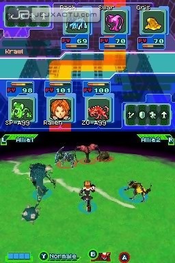 Le principe de la collection est ici mis en avant avec pas moins de 500 créatures à découvrir. Le jeu est d’ailleurs livré avec 4 cartes perforées sur les 12 possibles. Un moyen supplémentaire d’encourager les échanges entre joueurs. L’aspect communautaire est également priviligié par l’organisation simple de tournoi jusqu’à 16 intervenants. Si l’exhaustivité est au rendez-vous, les Spectrobes ne sont malheureusement pas aussi charismatiques que n’importe quel Pokémon. Si la durée de vie se suffisait à elle-même, le scénario est niais au possible et en rajoute une couche pour augmenter artificiellement le temps de jeu. Petit exemple : après avoir récupérer une gemme pour un chasseur de trésor, on se rend quelques missions plus tard qu’il s’agit d’un carburant d’un vaisseau extraterrestre. Rien d’anormal si ce n’est que l’on est obligé de traverser à nouveau un labyrinthe pour se "rendre compte" qu’on a pas récupéré la gemme du chasseur de prime. Bien sûr, celui-ci nous la confiera à condition de lui rapporter un objet de même valeur. Petit problème, la relique se trouve dans un endroit où l’air est corrosif. Pour s’en protéger, il faut acheter une combinaison spéciale… disponible à un prix d’or. Et c’est parti pour deux ou trois heures de combat intensif. Autre exemple : si les Spectrobes peuvent atteindre leur forme évoluée via l’incubateur du laboratoire, on aura plus vite fait de se rendre dans le désert afin de trouver le défi caché consistant à remporter une trentaine de combats à la suite pour gagner un Minéroc spécial. Sans être très détaillé non plus, le résultat graphique Spectrobes reste correct et prouve que la DS peut s’essayer à la 3D sans rougir. En revanche, on est moins indulgent avec le level design et on encourage les développeurs à revoir leur copie pour la prochaine fois. Les villes sont peu ergonomiques où l’on peine à trouver un marchand ou encore les environnements dont la pauvreté nous amène à tourner plusieurs fois en rond sans même que l’on s’en rende compte. Utilisé dans les menus, le double écran est également utilisé comme le prolongement direct de l’écran inférieur.