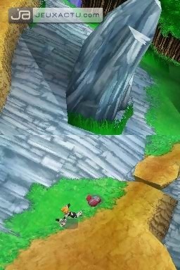 Le principe de la collection est ici mis en avant avec pas moins de 500 créatures à découvrir. Le jeu est d’ailleurs livré avec 4 cartes perforées sur les 12 possibles. Un moyen supplémentaire d’encourager les échanges entre joueurs. L’aspect communautaire est également priviligié par l’organisation simple de tournoi jusqu’à 16 intervenants. Si l’exhaustivité est au rendez-vous, les Spectrobes ne sont malheureusement pas aussi charismatiques que n’importe quel Pokémon. Si la durée de vie se suffisait à elle-même, le scénario est niais au possible et en rajoute une couche pour augmenter artificiellement le temps de jeu. Petit exemple : après avoir récupérer une gemme pour un chasseur de trésor, on se rend quelques missions plus tard qu’il s’agit d’un carburant d’un vaisseau extraterrestre. Rien d’anormal si ce n’est que l’on est obligé de traverser à nouveau un labyrinthe pour se "rendre compte" qu’on a pas récupéré la gemme du chasseur de prime. Bien sûr, celui-ci nous la confiera à condition de lui rapporter un objet de même valeur. Petit problème, la relique se trouve dans un endroit où l’air est corrosif. Pour s’en protéger, il faut acheter une combinaison spéciale… disponible à un prix d’or. Et c’est parti pour deux ou trois heures de combat intensif. Autre exemple : si les Spectrobes peuvent atteindre leur forme évoluée via l’incubateur du laboratoire, on aura plus vite fait de se rendre dans le désert afin de trouver le défi caché consistant à remporter une trentaine de combats à la suite pour gagner un Minéroc spécial. Sans être très détaillé non plus, le résultat graphique Spectrobes reste correct et prouve que la DS peut s’essayer à la 3D sans rougir. En revanche, on est moins indulgent avec le level design et on encourage les développeurs à revoir leur copie pour la prochaine fois. Les villes sont peu ergonomiques où l’on peine à trouver un marchand ou encore les environnements dont la pauvreté nous amène à tourner plusieurs fois en rond sans même que l’on s’en rende compte. Utilisé dans les menus, le double écran est également utilisé comme le prolongement direct de l’écran inférieur.