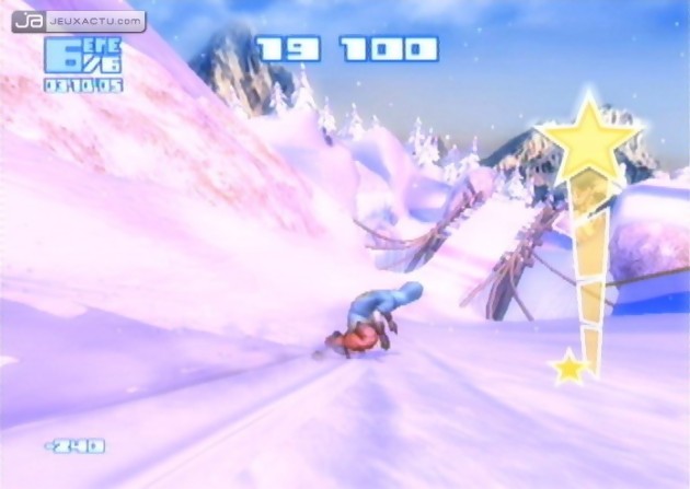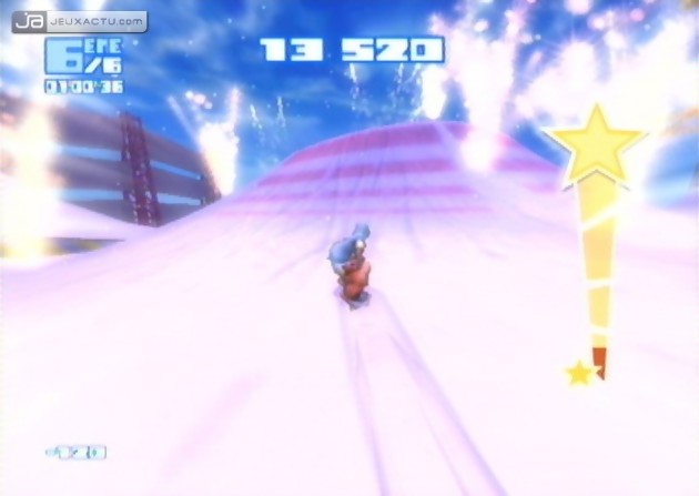 Toujours avec le Nunchuk, on peut sauter en donnant un coup bref vers le haut, ou exécuter des grabs d'école en appuyant sur Z. Avec la Wiimote, on peut sortir de ses moufles des tricks de toutes sortes qui servent à faire grimper le groove meter. Une fois la jauge au maximum, on peut alors réaliser des übertricks, un terme à forte consonance allemande qui désigne des figures un peu plus complexes à exécuter. Un peu de la même manière qu'un Mario Slam Basketball, il faut mimer à l'aide de la Wiimote des mouvements qui s'affichent brièvement à l'écran. Cela va du simple Z aux boucles les plus tordues. Une discipline particulièrement difficile à réaliser pour deux raisons. La première c'est que les symboles apparaissent de façon quasi furtive en bas de l'écran, sans compter le laps de temps nécessaire pour que l'info remonte jusqu'aux neurones. La seconde c'est que la reconnaissance de mouvements n'est pas assez indulgente, et même en tirant la langue on réussit à claquer un übertrick quatre fois sur dix. Au final, on se retrouve à exécuter la plupart du temps les acrobaties de base pour assurer les points à défaut d'assurer le spectacle. Plus on avance dans les compétitions artistiques, plus les étoiles d'or sont difficiles à décrocher et plus on a besoin de gros points, et donc d'übertricks, pour finir vainqueur de l'épreuve. Cela dit, on ne peut pas reprocher à SSX Blur de nous imposer un entraînement intensif pour exécuter ses figures les plus spectaculaires. Par ailleurs, le groove meter fait également office de barre de boost, un moyen comme un autre d'inciter le joueur à réaliser des figures dès qu'il en a l'occasion.