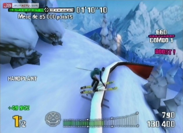 Mais dominer les pistes ne revient pas seulement à battre le chrono de vos adversaires et les griller sur la ligne d’arrivée. Les challenges sont multiples avant de devenir le numéro un mondial selon le magazine TransWorld Snowboarding (tiens donc ! le revoilà lui !). Si bien sûr la compétition réside dans le fait de s’imposer face à la concurrence lors de manches très disputées, il ne faut oublier les évènements solos qui vous testent sur votre style. Pour ce faire plusieurs épreuves seront à votre disposition : récupérer un max d’items, réaliser un trick monstre, faire pêter le tableau des high scores, grinder sur tant de mètres, accumuler un certain temps dans les airs ou même frapper 10 touristes durant votre descente. Tous ces défis nécessiteront une bonne maîtrise du gameplay. Et SSX on Tour est un jeu 100% arcade, au même titre qu’un FIFA… Bon ok, j’en charrie certains là. Donc, sa jouablilité est des plus simples même pour un novice de la série. Une fois les bases acquises, on enchaîne les tricks sans soucis. Cela dit, il faut un certain temps d’adaptation tout de même pour maîtriser les spins et les flips. Ces rotations horizontales et verticales sont associées à la croix multidirectionnelle du pad. C’est-à-dire que durant le jeu, une fois en l’air, il faudra lâcher le stick analogique (servant à diriger le rider) pour basculer sur la croix et ainsi offrir un peu plus de dynamisme à vos tricks. A vous donc les Natural Back Flip 360 Safety, les Switch BS 360 Stalefish, les Switch Front Flip Method ou les FS Rodeo Stalefish to Late Mute grâce aux trois boutons associés aux différentes manœuvres de grabs. Et pour les plus casse-cous d’entre-vous, vous pouvez aussi mixer toutes ces figures à des grinds ou des handplants selon les modules disponibles. Plus vous réaliser de tricks, plus vous remplissez votre jauge de boost qui une fois pleine permet de se lâcher grâce à des tricks monstres synonymes d’un maximum de points. Le fun poussé à son paroxysme donc grâce à un gameplay intuitif doublé d’un level-design offrant une grande liberté d’action.