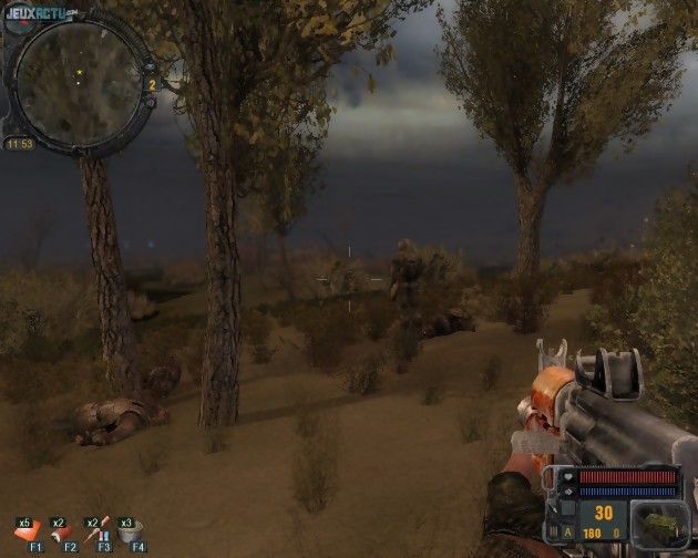 Heureusement, l'immersion reprend très rapidement ses droits puisqu'on se retrouve débarqué en pleine nature, un fusil et deux semaines de provisions pour seuls compagnons. Il n'y a plus qu'à tenter d'approcher le groupe de stalkers le plus proche ! Les habitués de la série apprécieront de se retrouver instantanément plongés dans le grand bain, mais les novices risquent de peiner un peu. Pas de didacticiel pour vous expliquer clairement à quoi servent les boulons ou comment utiliser le détecteur d'anomalies par exemple. Des efforts d'accessibilité ont pourtant été faits puisque le jeu se dote d'une nouvelle interface qui offre quelques raccourcis vers les medikits et autres soins d'urgence. Il faut bien cela pour survivre aux blessures, radiations et autres plaisirs de la vie quotidienne à Chernobyl ! Cependant, les puristes aux tendances masochistes pourront désactiver cet affichage, afin de mieux respecter l'isolement et l'oppression du survivant. Quant aux nouveaux venus, ils feraient tout de même bien de terminer STALKER, et éventuellement Clear Sky, avant d'aller plus loin. Bien que vendue à prix modique, la nouvelle extension reste plus chère que les deux titres qui l'ont précédée, aujourd'hui disponibles en gamme budget. Et les bugs qui les affectaient à leur sortie ont été corrigés par de nombreux patchs. A ce propos, signalons une nouvelle importante, capable d'arracher un sourire aux plus grincheux d'entre nous : Call of Pripyat fonctionne parfaitement bien "out of the box" et peut se terminer d'une traite sans que l'on rencontre de problème majeur.