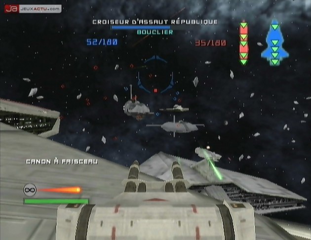 Mieux encore, l’utilisation de véhicule s’avère fructueuse et à ce niveau-là LucasArts Entertainment a fait les chose en grand en proposant un large choix d’engins : les motos jet 74-Z, les chars d’assaut TX-130S, les droïdes araignée, les TR-TT ou encore les fameux AT-ST affiliés à l’Empire. Selon la classe de véhicules choisie, le blindage sera plus ou moins résistant et la vitesse de déplacement variera selon le poids de l’engin. Mais la plus grosse nouveauté de ce Star Wars : Battlefront II réside dans l’apparition des combats spatiaux comme on les connaît dans Star Wars : Rogue Leader : Rogue Squadron II ou Star Wars : Starfighter. Et à vrai dire, la maniabilité des X-Wing, chasseurs TIE, A-Wing, V-Wing, Y-Wing ou bombardiers CSI est on ne peut plus simple. Les combats galactiques rendent un très bel hommage à l’œuvre magistrale de Georges Lucas et on se prend vite au jeu grâce à une très bonne configuration des boutons pour les phases de tirs, de boost ou d’atterrissage. Heureusement que tout ceci coule de source car les missions dans l’espace sont plus difficiles que les phases à pied à cause de l’arsenal implanté dans les Croiseurs interstellaires et de leur bouclier indestructible. Cependant, la meilleure technique pour venir à bout de la flotte ennemie est de se rendre au cœur même des Croiseurs afin de les saboter. Que ce soit donc sur terre ou dans les airs, les batailles sont vraiment impressionnantes et on prend plaisir à les mener de bout en bout même si, il faut le reconnaître, la répétitivité des objectifs rend le soft de Pandemic Studios un tantinet lassant à la longue.