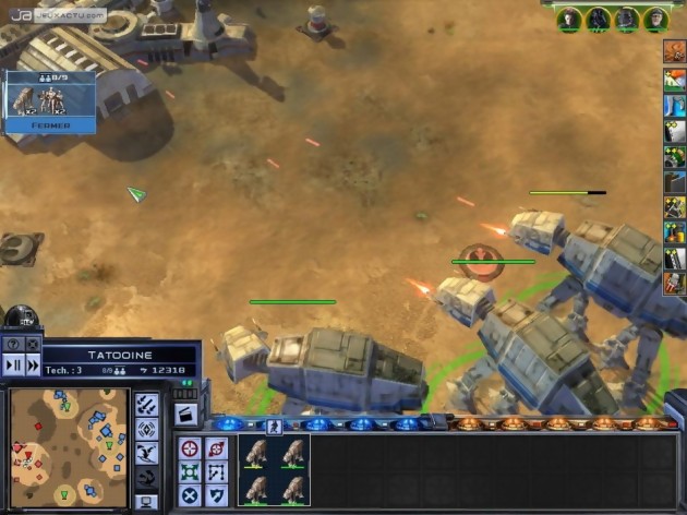 On trouve tout de même deux bonnes idées dans ce jeu. Dans l’espace, il est possible de cliquer sur une vue cinéma lors des affrontements. Elles sont très dynamiques, contrairement au rythme général du jeu et proposent des vues dignes des films. De plus, lorsque vous êtes certain de remporter une victoire, il est possible de passer un combat (excepté dans les missions obligatoires : capture de la princesse, massacre des Bothan…). Dans les faits, on passe son temps à ça d’ailleurs, tant les combats sont inintéressants. Seul le mode escarmouche tire un peu son épingle du jeu avec des règles similaires mais la possibilité de construire des troupes pendant la partie. Cela reste cependant du Capture The Flag. Heureusement que la licence Star Wars est là pour que le joueur ait envie de terminer le jeu. Pour ma part, j’ai terminé la campagne pour piloter l’étoile noire. Résultat : frustration. Comme dans toutes les autres missions spatiales, on débarque avec des super destroyers, et dès que possible, on appuie sur un bouton pour détruire la planète. Les rebelles ne peuvent même pas l’attaquer, elle est considérée comme un objet du décor. Finalement, les deux premiers jeux de stratégie Star Wars étaient plus intéressants. Et là, tout est dit.