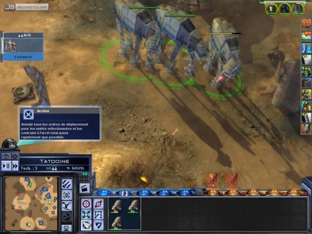Après vous être mis en orbite autour de la planète convoitée, il faut débarquer. Au départ, les unités ne sont pas très puissantes mais avec quelques AT-ST, il y a moyen de composer. Attention, cette phase de jeu ne contient aucune production de bâtiments et de troupes. Vous débarquez avec une poignée d’hommes et les troupes massées en orbite sont vos renforts. La zone de largage vous permet de posséder sur l’ensemble de la carte un certain nombre d’unités. En vous emparant d’autres points de largage, vous pourrez posséder plus de troupes sur le terrain. Les objectifs sont ici plus variés bien que la finalité soit toujours la même : tuer les ennemis. Là encore, les premières minutes sont cruciales. On distingue très vite les défauts. Le rythme, tout d’abord. Les troupes mettent parfois des plombes à s’entretuer. La possibilité d’accélérer le temps est là, heureusement et on joue toujours en accéléré. Mais il faut quand même le voir pour le croire. Imaginez vous 5 ou 6 AT-ST entourant un petit groupe de 8 ou 9 rebelles et leur tirer dessus pendant deux minutes ! Incompréhensible problème de rythme. L’arrivée des AT-AT règle ce problème mais ils ne sont disponibles qu’à la moitié de la campagne. Mais où sont donc les magnifiques statistiques équilibrées que l’on trouvait dans l’ensemble des jeux Command and Conquer ? L’ensemble de la campagne est scriptée, dans le bon sens du terme. De temps en temps, vous devez prendre une planète spécifique ou escorter l’empereur à un endroit précis. En la capturant, vous passez un niveau technologique supplémentaire. Vous obtenez alors la possibilité d’améliorer toutes vos planètes. Ce sont de loin les missions les plus intéressantes, quand l’empereur doit par exemple éliminer seul des centaines de Bothans (au sol) ou que Vador ait pour ordre de capture le vaisseau de la princesse, avec un rayon tracteur (dans l’espace, bien entendu).
