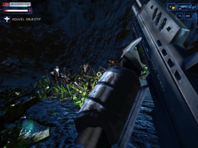 Sur le papier, l'idée d'adapter Starship Troopers sur nos écrans de moniteur semblait bonne mais on pourrait malheureusement résumer le jeu en quelques mots : le tir à vue. Starship Troopers privilégie donc l'action pure et dure, illustrée par les flots continus de ces satanées bestioles qui nous obligent à maintenir constamment le doigt sur la gâchette. Amusant au départ, c'est tout de même un peu plat comme concept et surtout cela devient rapidement ennuyeux ! Conscient du problème, les développeurs ont tenté de briser un peu cette monotonie en nous garnissant de quelques objectifs à accomplir lors du briefing ou au cours de la mission. Il faudra notamment protéger une unité en particulier (troupe du génie ou officier gradé), escorter une escouade d'un point à autre ou encore tenir une position. C'est toutefois peine perdue et on pourrait se demander comment il pourrait en être autrement quand l'écran de statistiques oscille entre 1000 et 2000 insectes liquidés par mission. Un élément on ne peut plus négligé qui devient même une source d'ennuis lorsque l'on se fait littéralement submerger par un ennemi présent en surnombre. Tout devient alors terriblement confus – agrémentés parfois de problèmes d'affichage – et on ne comprend plus rien à la situation. Les bords de l'écran clignotent en bleu pour signaler que vos ennemis à huit pattes transpercent peu à peu votre armure et généralement, il faudra blaster dans tous les sens en espérant nettoyer la zone et y voir plus clair. Frustrant.