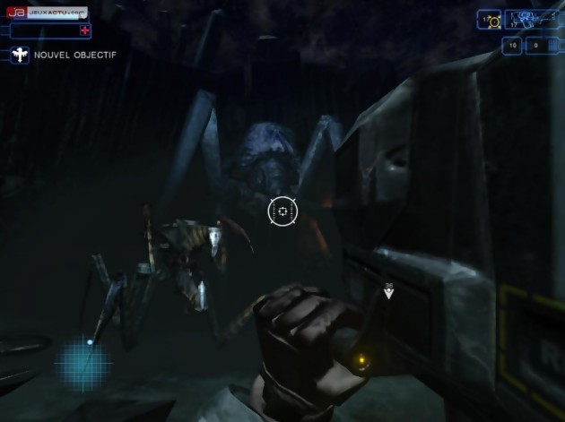 Heureusement, la résistance de votre armure n'a plus rien à prouver et cette dernière peut même se régénérer automatiquement (un système repompé sur Halo et qui commence à devenir le standard dans tous les FPS) pour peu que l'on reste tranquille durant quelques instants. On dispose également d'une palette d'armes appréciable et chaque bug s'élimine plus ou moins facilement selon l'équipement adopté. De même, les arachnides possèdent chacun leur talon d'Achille et il faudra par exemple viser la partie nerveuse (au centre) pour se défaire des insectes classiques alors qu'il n'y aura pas d'autres alternatives possibles que de tirer sur la tête d'un char pour s'en débarrasser. Dans le même ordre d'idées, le fusil d'assaut M4 s'annonce comme l'arme idéale contre les "Guerriers", le Mortia MK2 se destine davantage contre les arachnides blindés et le LRM (Lance-Roquettes Multiples) fera fureur sur les imposants bugs plasmas dont la portée de tir n'atteint pas moins les méandres de l'espace. Tout cet arsenal dispose généralement d'une fonction secondaire – il s'agit la plupart du temps d'un lance-grenades – et parfois enclins à la surchauffe. Une jauge permet de mesurer l'évolution de la température et il vaudra mieux tirer par petites saccades contrôlées que faire feu continuellement pour ne pas se trouver dans une situation délicate.