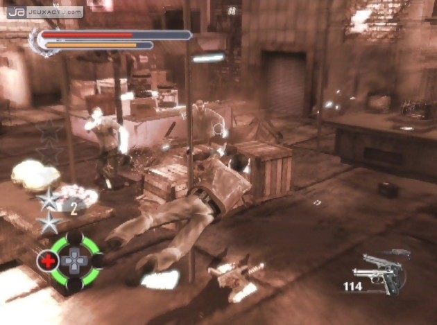 Si l’action peut paraître confuse de prime abord, entre la nuée d’ennemis à abattre, le décor qui vole en éclat et les balles qui fusent de partout, on apprend rapidement à repérer les éléments les plus importants dans le jeu. Car Stranglehold, c’est aussi la faculté à repérer le moindre objet qui brille au loin pour pouvoir avancer et se débloquer d’une situation qui commençait sérieusement à nous taper sur les nerfs. Les missions se déroulant dans le port tranchent radicalement avec celles du restaurant, puisqu’on passe de l’exploration active à la séquence de tir pure et dure dans une arène fermée. Si Stranglehold s’impose comme un cocktail explosif en matière de jeu d’action, il n’est pas moins exempt de défauts, à commencer par une gestion de la caméra pas toujours très docile. Certes, elle reste manuelle via le stick analogique droite et parvient globalement à se placer correctement dans les espaces vastes. Malheureusement, dès qu’il s’agit de pièces confinés ou de passages étroits, la caméra a bien du mal à se dépatouiller. On a vu pire mais c’est le genre de détails qui agacent ou qui lassent lorsqu’on a du mal à se retrouver dans des dédales de containers. Certains trouveront toujours quelque chose à redire en ce qui concerne l’intelligence très artificielle du jeu, mais en toute franchise, il ne fallait pas s’attendre à avoir en face de nous des mercenaires aussi dégourdis que ceux de F.E.A.R.