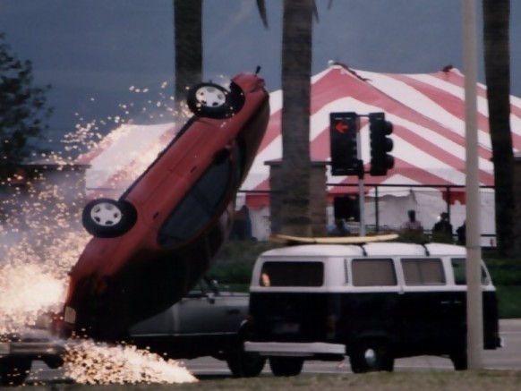 Reflections, à l’origine des Driver et autres Destruction Derby, a su dénicher un filon fort peu exploité dans les jeux vidéo : faire d’un jeu un véritable film. Vous êtes un cascadeur qui doit faire ses preuves et bien évidemment tout effort mérite salaire, le succès ne va pas arriver dès le premier jour. Petit à petit, au fur et à mesure de vos performances de voltigeur et de pilote confirmé, les studios vous ouvriront les portes de la gloire, non sans souffrir … durement souffrir. Au début de votre carrière, vous serez amener à conduire dans une circulation plutôt fluide, passer dans un couloir sans écailler la peinture de la voiture sur les murs, effectuer quelques dépassements ainsi que des rotations au frein à main. Facile. Et puis, petit à petit, des courses-poursuites dans des rues étroites, des tonneaux, des sauts, éviter les explosions, passer entre deux trains, sauter une falaise, éviter un arbre qui tombe, sauter de la voiture en marche, etc. Bref, on vous en demandera toujours plus pour les besoins du film. Et lors de chaque séquence, vous devrez apprendre à maîtriser un nouveau véhicule, d’un Monster Truck à la moto des neiges en passant par un bus ou une cabriolet. Bref vous aurez du pain sur la planche !