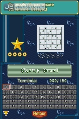 Du Sudoku sur DS ? L’idée n’est pas née d’hier et tous ceux qui se sont laissés séduire par le Programme d'Entraînement Cérébral du Dr. Kawashima en juin dernier, ont certainement dû apprécier les quelques grilles de Sudoku qui étaient proposées sur la cartouche. Une petite mise en bouche avant l’arrivée massive de titres de ce genre, capables de captiver l’attention de n’importe qui, joueur ou pas, homme et femme, enfant comme adulte. Le premier à se lancer n’est autre que Sudoku Master, sorti au Japon sous le titre Puzzle Series Vol.3 Sudoku au mois de mars dernier. C’est Hudson Soft, le spécialiste du jeu convivial et familial, qui s’est chargé du développement. Réparties en différents degrés de difficulté (Dacile, Normal et Difficile), les 400 grilles de Sudoku sont complétées par d’autres tableaux dans le mode "Jeu d’achélon", qui exige du joueur une concentration plus extrême puisqu’il est demandé par exemple de terminer une grille en un certain temps. De quoi faire travailler notre matière grise, en manque d’exercice si l’on s’en tient aux résultats enregistrés par le Programme d'Entraînement Cérébral du Dr. Kawashima. Si plusieurs séries de grilles sont accessibles d’entrée de jeu, sachez que la suite se débloque au fur et à mesure que l’on complète l’une de ces grilles. Simple d’accès grâce à l’utilisation du stylet qui prend ici tout son charme, Sudoku Master souffre en contre-partie d’une mise en page assez sommaire voire même austère, avec un habillage franchement cheap. D’autant que les deux écrans de la DS sont utilisés à mauvais escient. La grille apparaît par deux fois, limitant ainsi l’intérêt de l’écran supérieur puisque les yeux sont en effets rivés sur l’écran tactile avec lequel on chapeaute l’ensemble de sa grille. On perd ainsi en visibilité et également en charme visuel. Le constat est à peu près le même avec la bande sonore, notamment la musique, digne de figurer dans les salles d’attente les plus morose qui soit. C’est bien dommage.