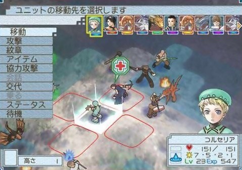 Du côté du panel de personnages, rien de vraiment innovant : des épéistes plutôt nombreux côtoyant des mages et des archers. Il sera surtout primordial d’optimiser le placement et les aptitudes de chacun afin d’éviter la mort soudaine d’une de vos unités par un malencontreux coup critique dans le dos. Ici, à la manière d’un Fire Emblem, il est possible de perdre définitivement un personnage, événement aléatoire qui nous amène très vite à croiser les doigts à chaque décès. Certes, pour les puristes voulant porter tout leur petit monde à la victoire en un seul morceau, il existe la commande rejouer, mais les maps sont assez longues et éprouvantes et voir un personnage disparaître quand on touche enfin au but est terriblement frustrant. Mais je ne cache pas que ce petit aléa peut être finalement un bon stimulant et surtout un bon remède à un style de jeu trop barbare. D’autant que les plus frileux pourront se rassurer, les protagonistes principaux ne souffrent pas de ce handicap, et quitteront simplement la bataille au lieu d’y laisser leur vie. Il sera donc tout à fait possible de se constituer une équipe "d’immortels" et finir ainsi le jeu. A la fin de chaque combat, outre l’argent et les éventuels objets bonus, le joueur se voit attribuer des points de compétence qu’il pourra répartir à loisir entre ses personnages pour augmenter les rangs de leurs capacités. Ils peuvent par ce système acquérir la possibilité de contre-attaquer, d’augmenter le nombre de frappe, de gagner des cases de déplacement ou encore d’augmenter leur puissance magique. On peut ainsi choisir entre une bonne dizaine d’aptitudes pour personnaliser un peu plus ses combattants.