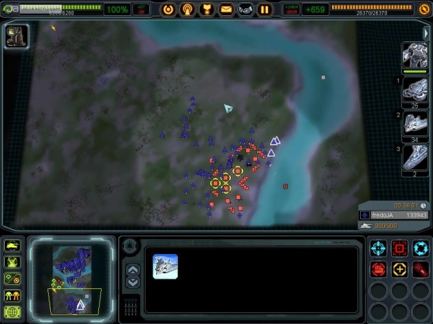 Les maps étant démesurément grandes, la masse d’informations à traiter l’est tout autant. Comment alors gérer sa propre base, les différents champs de batailles, surveiller les activités ennemis et la gestion des ressources ? Les développeurs ont apporté toute une panoplie de solutions, à commencer par le système de zoom. Ainsi, la vue satellite représente toutes les armées et infrastructures par des formes géométriques (triangle, carré, etc.) de couleur. En un seul coup d’œil, on a ainsi une vue globale de toute la map et l’on peut par exemple facilement coordonner plusieurs attaques. La vue peut ensuite être zoomée jusqu’à voir une seule et unique unité. Vraiment impressionnant ! Le zoom se veut donc un outil puissant et indispensable du stratège en herbe puisqu’il permet une gestion plus fine de son armée. En un seul clic, on peut ordonner le déplacement de toute une armée, faire décoller les avions espions ou affecter une protection aérienne à une armée terrestre Le déplacement des unités peut d’ailleurs se faire en plusieurs étapes. En maintenant, shift enfoncé, on détermine les différents points de passage. Cerise sur le cake, le double monitoring est intégralement pris en charge par le jeu et il s’agit là plus que d’un simple gadget. L’affichage est entièrement personnalisable et les deux écrans se complètent à merveille. Pendant qu’un se concentre sur la vue satellite pour une vision plus globale du champ de bataille, l’autre moniteur zoome plus intensément sur le champ de bataille pour une gestion plus fine des opérations. On peut faire la même chose pour surveiller à la fois le champ de bataille et sa propre base. Bien entendu, les joueurs les moins fortunés peuvent subdiviser leur moniteur en plusieurs parties pour obtenir la même configuration.