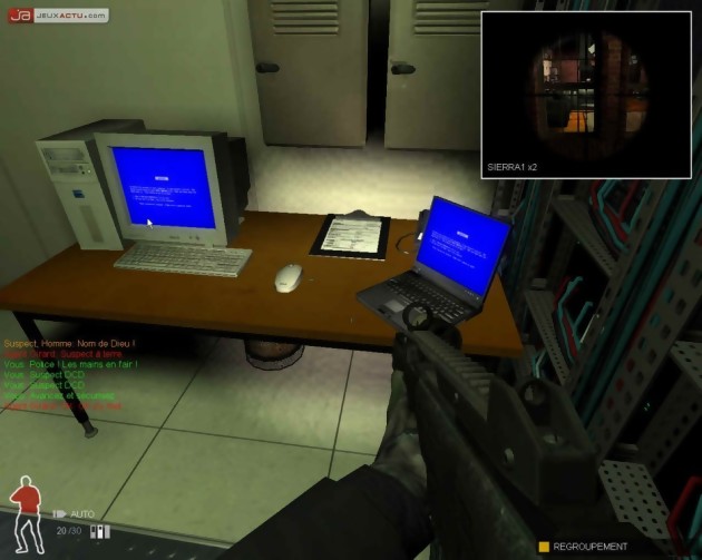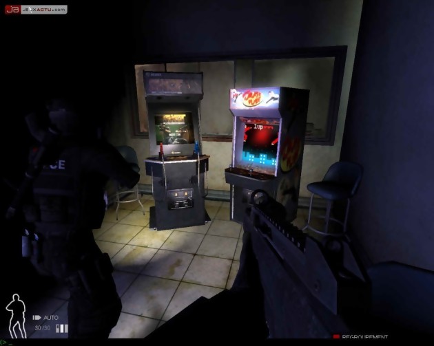 Pour bien faire, tout un tas d’armes secondaires, qui viennent s’ajouter à votre arme principale, vous permettront de stopper les suspects. Cela va de la bombe lacrymogène au pistolet électrique Taser en passant par des grenades incapacitantes et des grenades de saturation sensorielle. C’est ici que les termes réflexion et préparation, dont je vous parlais plus haut, prennent tous leur sens. Préparation de votre équipement et de celui de vos hommes en fonction de la mission, et réflexion avant d’assaillir des suspects pour qu’il n’y ait pas de dérapage. A ce sujet, on regrettera le fait que nos hommes aient souvent la gâchette un peu facile et répondent au premier coup de feu par une salve de balles généralement bien placées et imparable pour vos adversaires. Pour bien faire et réussir les meilleurs scores, vous devrez agir presque seul en laissant vos coéquipiers en couverture. Si les objectifs ne sont pas très diversifiés, on se consolera avec des cartes plutôt bien pensées, bien que se déroulant à 95% en intérieur. On avance alors prudemment, en prenant soin de regarder sous les portes avec notre bâton optique pour évaluer le risque d’une pièce à l’autre. Portes closes, suspects cachés dans les coins ou derrière des bureaux, détonateurs pour ouvrir les portes, sniper alliés en couverture sur les niveaux à plusieurs étages, rien n’a été laissé au hasard. On salut au passage l’énorme travail de reconnaissance et de précision dans les interventions qui nous placent presque au cœur d’un film. On ne s’attardera pas sur la partie shoot, elle n’a bien évidemment que peu d’intérêt en comparaison d’un Half-Life 2, mais est suffisamment pointue pour le peu qu’on ait à s’en servir.