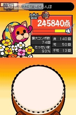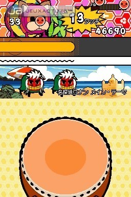 Pour ceux qui ne connaissent pas, la série Taiko no Tatsujin fait partie de la grande famille des jeux musicaux. Ancêtre du génialissime Donkey Konga, le jeu imaginé par Namco a d'abord vu le jour dans les salles d'arcade, avant d'être adapté sur consoles, et plus précisément sur PlayStation 2 où il rencontra un vif succès. Dans Taiko no Tatsujin DS, il s'agit d’accompagner les morceaux à l'aide d'un tambourrin, le taiko, un tambour traditionnel qui se joue avec des bachipen, des baguettes en bon français. Bien qu’il n’y ait pas de controllers comme dans la version PS2, la conversion DS semble mieux pensée que celle parue sur PSP, où le joueur devait se contenter des boutons de tranche pour taper sur les tambourins. Cette mouture a su optimiser l'interactivité de la DS en fournissant deux bachipen à l'effigie de l’instrument mascotte de Namco. Ces stylets ont l'avantage d'être un peu plus grands et plus épais pour une meilleure prise en main. Ils se distinguent par leur couleur : rouge pour l'un et bleu pour l'autre. Le contact bruyant avec le tambourin devient alors presque jubilatoire.