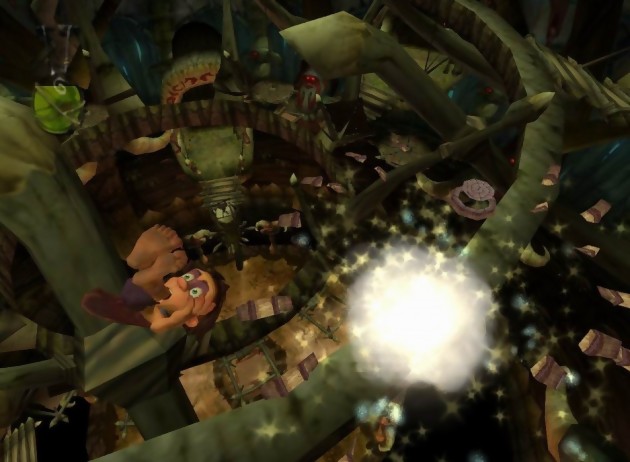 Concrètement, on distingue trois étapes bien distinctes dans ce titre : des phases de plates-formes pures et dures qui s’éclipseront régulièrement au profit de trop nombreux affrontements et de phases de "glisse" où il s’agit généralement de traverser un torrent déchaîné ou un parcours de glace, un peu à la manière de Hugo Délire en son temps, mais en nettement plus dynamique. Ces étapes hétéroclites s’alternent agréablement mais sont néanmoins responsables de la grande linéarité du jeu. Ainsi, il faut traquer tous les ennemis d’une zone pour en déverrouiller une autre. Les plus pointilleux pourront également s’amuser à chercher des ingrédients à même le sol pour fabriquer des potions Juju qui permettront entres autres de débloquer quelques bonus et autres minis jeux. Si malgré tout les environnements sont particulièrement bien pensés, il apparaît évident que les développeurs manquaient clairement d’inspiration pour finir le titre. En effet, non content de se retrouver par trois fois avec un tableau similaire, la difficulté vraiment mal dosée finira par en rebuter plus d’un. Quoiqu’il en soit, notre petit héros ne meut jamais et retourne toujours au checkpoint le plus proche en cas de malheur. Et je serais tenté de dire heureusement car on ne compte plus le nombre de KO avant que l’écran titre affiche enfin les crédits de fin, après un peu moins d’une dizaine d’heures. Après l’effort, le réconfort, et Tak 2 se transforme alors en un party-games plutôt réussi et qui permet de jouer jusqu’à deux simultanément sur de petits jeux conviviaux.