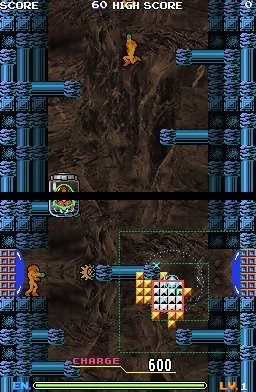 Tetris DSLes deux modes restants se démarquent des autres puisqu’ils font appel au stylet, quelque peu laissé de côté dans ce Tetris DS, il est vrai. Par réflexe, on choisira le mode "Touch" qui fait partie des modes les plus pertinents du jeu. Avec pour fond visuel et musical l’univers de Balloon Kid, le but ici consiste à déplacer toute la série de pièces assemblées les unes aux autres de façon désordonnée afin de débouchonner le passage. Cela peut paraître simple au premier coup d’œil mais la difficulté est tout autre et certaines épreuves risquent de faire devenir chèvre certaines personnes dont le self control n’est pas l’une de leurs qualités. Heureusement, il existe moult façons pour débloquer ce bordel géométrique mais il va falloir souvent faire appel à sa jugeotte pour anticiper certaines chutes. Quant à ceux qui trouvent le challenge pas assez épicé, il leur reste le fameux mode "Puzzle" qui risque de griller un paquet de neurones. Dans ce mode, il faut éliminer tous les blocs situé sur l’écran supérieur uniquement à l’aide des Tetriminos qui sont proposés. Il est bien évidemment possible de les faire pivoter de sens mais l’astuce ne paraît pas si simple à trouver, surtout lorsqu’on commence sérieusement à avancer dans les tableaux qui en comporte 200 au total ! Avec six modes de jeux prévus pour le mode solo, Nintendo s’est montré fort généreux, d’autant qu’aucun n’est à jeter et leur intérêt est tout aussi important, puisque totalement différent et prenant.