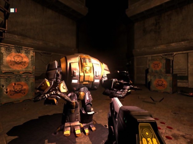 L’obscurité est votre meilleure arme pour neutraliser quiconque se mettra sur votre chemin. Accroupi dans le noir, vous saurez grâce à un changement de vision que vous êtes à l’abri. Guettez bien votre proie et attaquez-la dans son dos afin de la saisir à la nuque et lui briser les cervicales. C’est ainsi que vous parviendrez à vos fins sans trop de heurts. Si vous engagez le combat avec un garde, ce dernier n’hésitera pas à faire feu pour vous anéantir. Il existe néanmoins une parade efficace contre toute résistance armée. Si vous appuyez au bon moment sur la gâchette droite, vous retournerez le fusil contre son agresseur pour lui éclater la tête. Fort heureusement pour l’intérêt du jeu, vos ennemis sont dotés d’une excellente I.A. Ils n’hésiteront pas à battre en retraite pour éviter ce cas de figure. N’essayez pas non plus de leur tendre un piège en passant dans une pièce voisine, l’arme à la main, prêt à faire feu dès que leur joli minois passera la porte. Les gardes approcheront à tâtons, scrutant de leur visée-laser les angles morts. J’ai volontairement occulté les phases de shoot de The Chronicles of Riddick afin de mettre en avant le savoureux mélange des genres que propose le jeu. Un soupçon de stratégie, une bonne observation, un minimum de réflexes, voilà ce que demande The Chronicles of Riddick pour apprécier à sa juste valeur les phases de combat et d’infiltration.