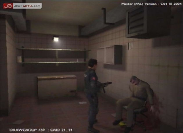 Vous pensiez vraiment que les problèmes techniques ne concernaient que les séquences de pilotage ? Vous êtes bien naïfs ma parole ! A pied, c’est le même topo. La démarche boiteuse des protagonistes fait honte à la motion capture. Passez-moi l’expression, mais on vraiment la sensation qu’ils déambulent avec un balai profondément enfoncé dans une partie intime de leur anatomie (NDMaxime : je ne vois pas de quoi tu parles ?). Comment voulez-vous apporter au soft un aspect de furtivité dans ce cas-là, surtout que la caméra nous joue des tours lorsqu’on pénètre dans les bâtiments. Il faut avoir le cœur bien accroché dans les couloirs car l’angle ne cesse de se recadrer derrière le personnage, peu importe sa position, peu importe ses actions, ce qui handicape énormément votre progression. Le problème est accentué à cause d’une maniabilité peu fluide et pas du tout intuitive. Les phases d’infiltration se résument simplement à se coller aux murs ou encore à s’accroupir pour éviter d’être trop à découvert lors des fusillades. Même si ces actions restent basiques, on aurait espéré pouvoir en tirer un quelconque avantage. Malheureusement il n’en est rien du fait d’avoir un système de visée mystérieux. Deux types de visées existent. L’une automatique, elle permet de cibler les ennemis facilement. Le souci, c’est que dans le feu de l’action le héros loque toujours la mauvaise personne. Pourquoi est-ce qu’il s’obstine à viser le petit gars au loin bien planqué derrière sa caisse alors que deux autres personnes complètement à découvert le canardent non-stop ? Changer de cible n’est guère facile, puisque vous balayez votre champ de gauche à droite. Il faut s’y reprendre à plusieurs fois pour trouver un bon poste de tir ou au contraire préférer la visée manuelle. Mais quelle galère puisque aucun curseur ne vous aide. Par conséquent, vous devez tirer une balle, voir son impact et vous fiez à cela pour faire mouche par la suite. Mieux avoir le compas dans l’œil sinon bonjour le gaspillage de munitions ! Lorsque vous incarnez Mitch, vous pouvez également balancer des fumigènes grâce à la touche L1. Très peu utile, cette technique paralyse automatiquement votre personnage. Dès lors que vous appuyez sur la touche maudite, Mitch se met en position pour balancer la grenade et il est tout bonnement impossible de faire bouger le bonhomme, ni même de le faire pivoter. Peu pratique pour ajuster son lancé, vous le reconnaîtrez. Dans la peau du boxeur, lorsque vous êtes désarmé, vous pouvez asséner quelques coups à vos agresseurs (coups de poings, coups de genoux, coup de boule) ou tout simplement leur casser la nuque si vous les attrapez dans le dos. Bien évidemment, les ralentissements et les bugs de collisions accompagnent chacun de vos faits et gestes. Team Soho a voulu une nouvelle fois exploiter à fond un moteur graphique poussif et vieillissant. Le problème, c’est que le studio de développement à réitérer les mêmes erreurs sans même songer une seule seconde à les réparer. Ce qui était à la rigueur pardonnable en 2002, ne l’est plus en 2004.