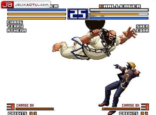 La première constatation flagrante se situe dès l’écran de sélection des personnages. Le character design est enfin revenu à celui des beaux jours et les belligérants possèdent au premier coup d’œil une classe des plus soignées. Au menu des festivités, on retrouve pas moins de 32 personnages répartis en équipe de 3 combattants, à l’exception des deux frères ennemis que sont Kyo Kusanagi (qui arbore encore une nouvelle tenue) et Iori Yagami faisant chacun cavalier seul. SNK Playmore semble avoir fait une croix sur le système de striker et c’est tant mieux ! La Hero Team est désormais représentée par la présence de Ash Crimson (adepte des flammes vertes), Duo Lon (la rapidité est son principal atout) et Shen Woo (agile avec ses poings ravageurs). La Fatal Fury Team a laissé filer Andy Bogard au grand dam des joueurs pour laisser place à Tizok, catcheur à tête d’aigle venu tout droit de Garou : Mark of The Wolves. L’équipe d’Art of Fighting reste fidèle à elle-même avec un tout nouveau sprite (plutôt raté) pour Robert Garcia. Bonne nouvelle pour la Korean Team, Choi Bounge s’est vu remplacé par l’excellent taekwondoïste Jhun Hoon. On s’en réjouit !