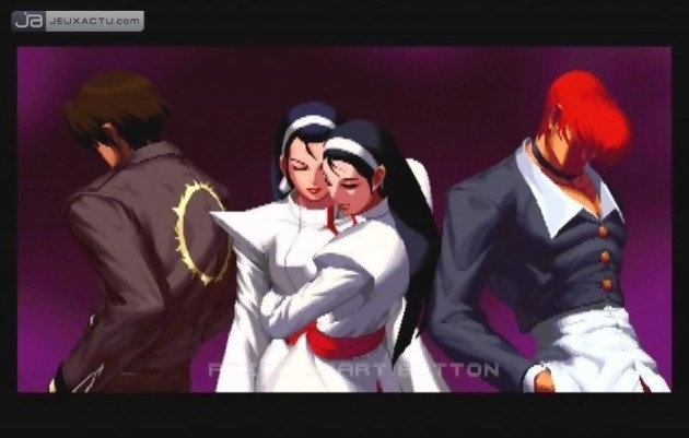 La Hero Team est désormais représentée par le Français Ash Crimson (adepte des flammes vertes), Duo Lon (la rapidité est son principal atout) et Shen Woo (agile avec ses poings ravageurs). La Fatal Fury Team a laissé filer Andy Bogard au grand dam des joueurs pour laisser place à Tizok, catcheur à tête d’aigle venu tout droit de Garou : Mark of The Wolves. L’équipe d’Art of Fighting reste fidèle à elle-même avec un tout nouveau sprite (plutôt raté) pour Robert Garcia. Bonne nouvelle pour la Korean Team, Choi Bounge s’est vu remplacer par l’excellent taekwondoïste Jhun Hoon. On s’en réjouit ! Pas de changement pour l’équipe Ikari Warriors ni pour celle de K’. En revanche, deux équipes de filles font désormais leur apparition. Celle des femmes plus adultes (King, Mai Shiranui et Blue Mary) et celle des filles plus jeunes, menée par Athena Asamiya qui a vu ses co-équipiers de la Psycho Soldiers Team poussés sur le banc de touche. Cette dernière est désormais épaulée par Hinako, notre Edmond Honda féminin et Malin, une nouvelle venue qui manie le yo-yo comme personne. La Outlaw Team signe son retour et le trio est désormais formé de Gato (issu de Garou : Mark of The Wolves), Billy Kane et Ryuji Yamasaki qui ont tous deux subi un léger lifting vestimentaire. Et enfin pour finir, on retrouve Benimaru Nikaido en tant que leader de l’équipe du Japon avec Shingo Yabuki et Goro Daimon à ses côtés. A l’inverse de la version Neo Geo qui nécessitait un cheat code, sachez que Kusanagi, Chizuru Kagura et sa sœur jumelle Maki sont désormais accessibles directement via l’écran de sélection des personnages. Bien entendu, vous avez le choix de composer vous-même votre équipe mais si vous souhaitez voir les fins respectives de chacune d’entre elle, il est impératif de choisir le trio originel. Maintenant que les présentations ont été faites, entrons dans l’arène pour voir si ce tout nouveau système de combat sera capable d’insuffler une nouvelle jeunesse à la saga.