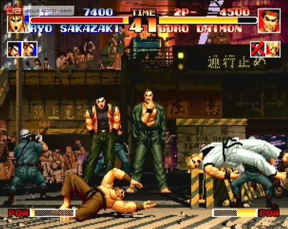 En évoquant le charme du titre, on ne peut s’empêcher de penser aux furies qui, à l’époque, donnaient un véritable sens au terme. Si chaque perso ne disposait que d’une seule attaque de dernier recours, cette dernière avait au moins le mérite de faire son petit effet. Un tiers de la barre de vie était effectivement retiré si on se la prenait de plein fouet. Gare aux imprudents donc qui pensent toujours qu’il est possible de se manger trois ou quatre furies en estimant qu’il restera suffisamment de souffle pour rester debout. Que nenni, KOF ’94 ne fait pas dans la dentelle et c’est la même tambouille une fois que vous aurez gonflé votre jauge de pouvoir. Une fois complète, votre bonhomme se met alors à clignoter pendant un certain temps (assez longtemps tout de même). En sus d’autoriser l’exécution de la furie (qui se déclenche aussi dès que le seul critique de barre de vie est atteint), votre force de frappe augmentera subitement de 20% et le moindre coup porté avec un strong punch ou strong kick laisse des traces qui oblige à réfléchir avant de foncer tête baissée. Cette sensation de puissance est fortement appuyée par le son émis à l’impact des coups. Retrouvez ce panache est un réel plaisir et on ne peut que s’apitoyer sur le fait de ne pas retrouver cette puissance dans les KOF dernières générations, KOF 2003 en tête de citation.