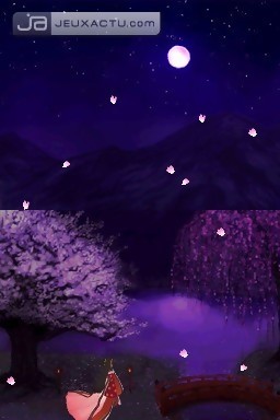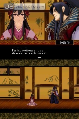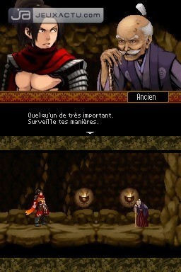 Les malheureux joueurs ayant découvert le jeu vidéo sur le tard ne le savent que trop bien : le old school est une notion retorse, parfois obscure, qu’il faut apprendre à apprivoiser. Dans The Legend of Kage 2, ce contentieux qui oppose les princes du paddle aux joueurs assistés est matérialisé par une gestion des sauts qui se fait tout en apesanteur, comme dans un Tigre & Dragon, qui ne permet pas toujours d’évoluer avec une extrême précision. Un constat d’autant plus dommageable que l’affichage du jeu dispose d’un “angle mort” qui peut vite devenir agaçant pour qui veut prendre son temps à explorer l’énorme espace offert par les différents niveaux. En effet, les développeurs n’ont pas réglé la représentation visuelle de manière à ce que les deux écrans de la DS se prolongent naturellement, si bien que les deux petits centimètres qui les séparent sur la console se retrouvent également dans le jeu. En conséquence, au dessus du crâne de nos héros se trouve en permanence une zone d’ombre dont on aurait bien aimé être dispensé. Les moins patients seront alors amenés à traverser les levels sauvagement, à grand renfort de sauts et de dash ; une technique par ailleurs bien aidée par l’inoffensivité des ennemis et le level design peu élaboré et totalement privé de fourberies. Reflet d’un titre qui manque de profondeur, cette option paresseuse et totalement dénuée de finesse ampute le développement des héros, notamment quand il sollicite la recherche d’items, comme les bonus qui rallongent la barre de vie ou les orbes élémentaires à combiner pour se créer une panoplie de ninjutsu, aussi variés que parfaitement inutiles lorsqu’on a du skill. Parallèlement, l’évolution de Kage et Chihiro se fait le plus naturellement du monde avec des attaques qui gagnent en efficacité et des habiletés qui s’acquièrent en fonction de notre manière de jouer. Le nombre de shurikens à lancer simultanément et la longueur du fundo augmenteront petit à petit, tandis que de nos nouveaux mouvements se chargeront d’accroître la souplesse de nos ninjas. Mais si la customisation est assez complète, elle se révèlera insuffisante face aux boss qui, comme chacun sait dans une production rétro, demandent un petit effort cérébral pour assimiler leurs patterns avant de mettre en place un schéma d’attaque cohérent et surtout efficace. Seuls véritables moments de tension, et donc de plaisir, ils ne peuvent malheureusement redresser à eux seuls le bilan médiocre d’un titre qui ne tient pas plus de trois heures pour les plus doués.