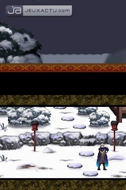Les malheureux joueurs ayant découvert le jeu vidéo sur le tard ne le savent que trop bien : le old school est une notion retorse, parfois obscure, qu’il faut apprendre à apprivoiser. Dans The Legend of Kage 2, ce contentieux qui oppose les princes du paddle aux joueurs assistés est matérialisé par une gestion des sauts qui se fait tout en apesanteur, comme dans un Tigre & Dragon, qui ne permet pas toujours d’évoluer avec une extrême précision. Un constat d’autant plus dommageable que l’affichage du jeu dispose d’un “angle mort” qui peut vite devenir agaçant pour qui veut prendre son temps à explorer l’énorme espace offert par les différents niveaux. En effet, les développeurs n’ont pas réglé la représentation visuelle de manière à ce que les deux écrans de la DS se prolongent naturellement, si bien que les deux petits centimètres qui les séparent sur la console se retrouvent également dans le jeu. En conséquence, au dessus du crâne de nos héros se trouve en permanence une zone d’ombre dont on aurait bien aimé être dispensé. Les moins patients seront alors amenés à traverser les levels sauvagement, à grand renfort de sauts et de dash ; une technique par ailleurs bien aidée par l’inoffensivité des ennemis et le level design peu élaboré et totalement privé de fourberies. Reflet d’un titre qui manque de profondeur, cette option paresseuse et totalement dénuée de finesse ampute le développement des héros, notamment quand il sollicite la recherche d’items, comme les bonus qui rallongent la barre de vie ou les orbes élémentaires à combiner pour se créer une panoplie de ninjutsu, aussi variés que parfaitement inutiles lorsqu’on a du skill. Parallèlement, l’évolution de Kage et Chihiro se fait le plus naturellement du monde avec des attaques qui gagnent en efficacité et des habiletés qui s’acquièrent en fonction de notre manière de jouer. Le nombre de shurikens à lancer simultanément et la longueur du fundo augmenteront petit à petit, tandis que de nos nouveaux mouvements se chargeront d’accroître la souplesse de nos ninjas. Mais si la customisation est assez complète, elle se révèlera insuffisante face aux boss qui, comme chacun sait dans une production rétro, demandent un petit effort cérébral pour assimiler leurs patterns avant de mettre en place un schéma d’attaque cohérent et surtout efficace. Seuls véritables moments de tension, et donc de plaisir, ils ne peuvent malheureusement redresser à eux seuls le bilan médiocre d’un titre qui ne tient pas plus de trois heures pour les plus doués.