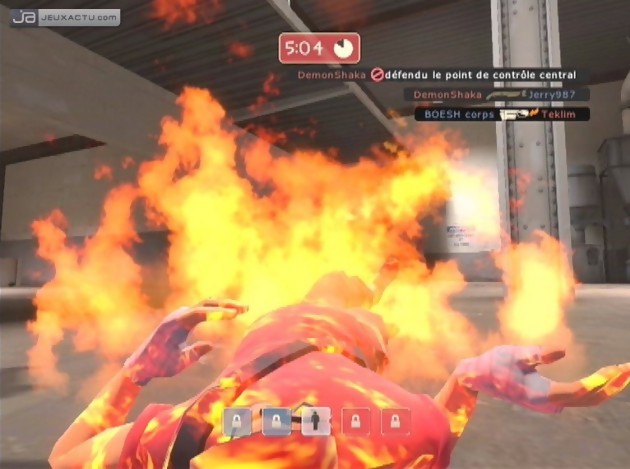 Alors derrière Team Fortress 2 se cache en réalité une longue histoire, une très longue histoire. Il faut en effet savoir qu'il a été annoncé à l'origine en 1999 et affichait un style graphique très sérieux, très premier degré. Finalement, huit ans plus tard, le bébé sort enfin et n'a plus grand chose à voir avec le projet de départ ! Un simple coup d'oeil sur les screenshots, et vous verrez qu'il a adopté un style très cartoon et donc une ambiance nettement moins austère. Pour résumer, vous jouez en équipe (jusqu'à huit joueurs) sur des maps proposant soit de la capture de drapeau, en l'occurrence une mallette, soit de la capture de zones ou de points de contrôle. L'intérêt ne réside pas tant dans le principe, assez basique, mais dans le fait que vous avez le choix parmi neuf classes de personnage, comme dans le premier Team Fortress d'ailleurs. Vous pourrez par exemple incarner un éclaireur, rapide et capable de faire un double saut, idéal pour aller vite attraper une malette par exemple, mais qui ne fera pas long feu en combat. Il y a un mitrailleur, un sniper, un médecin (tous les joueurs peuvent l'appeler en cliquant sur le stick droit, à lui de vite les retrouver pour leur administrer des soins), un espion (qui peut devenir invisible momentanément et mieux, se déguiser en n'importe quel personnage ennemi !), un ingénieur (qui peut poser des tourelles, entre autres), un soldat équipé d'un lance-roquette... Du coup, pour mettre un maximum de chances de leur côté, les joueurs d'une même équipe ont tout intérêt à se consulter pour répartir les rôles et optimiser leurs capacités.