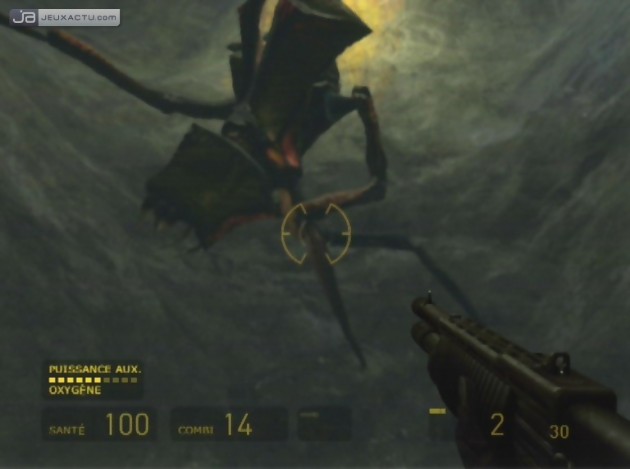 Le festival du FPS commence avec cette réédition bienvenue de Half-Life 2, sorti sur PC il y a trois ans déjà, puis adapté un an plus tard sur Xbox. On retrouve donc le héros du premier volet, Gordon Freeman, avec sa combi et ses lunettes tendance. Pour résumer, une expérience scientifique foirée avait mis un sacré boxon dans le centre Black Mesa, et Freeman s’était retrouvé au beau milieu de tout ça. Half-Life 2 débute dans un train, on ne sait pas trop ce qu'on fait là, mais arrivé à la gare, on se rend vite compte qu'on se trouve dans une société totalitaire avec la Police partout, des écrans géants diffusant la bonne parole d'un gourou et tout le toutim. Pour couronner le tout, d'étranges créatures arpentent les rues de la Cité 17 où notre héros vient d'arriver. Bref, ça commence bien ! Heureusement, un ancien pote de Black Mesa, Barney, déguisé en garde lui permet de s’évader pour finir par se retrouver l’une des pièces maîtresses de la résistance au Cartel, la mystérieuse organisation au pouvoir. Tout ça est donc un joli prétexte à faire vivre à Gordon un enfer pendant quatorze chapitres passionnants. Car Half-Life 2 a ceci de particulier qu'il mélange avec une facilité déconcertante scènes d'action très dynamiques et séquences très scénarisées à travers de cinématiques interactives. Ainsi à la manière de la séquence d'introduction mythique du premier épisode, le jeu ne prend jamais le risque de perdre votre attention en vous laissant toujours aux commandes, même si c'est juste pour regarder des gens discuter sans participer activement aux dialogues. Il faut ajouter à cela une progression certes linéaire, mais continue. Pas question de vous transporter d'un niveau à l'autre, tout se déroule en continue avec quelques chargements bien entendu. Du coup, malgré sa division implicite en chapitres s'autorisant des environnements et gameplay très variés, Half-Life 2 pourrait presque se vivre d'une seule traite ! Pourrait, car mine de rien, l'aventure dure une quinzaine d'heures (voir plus selon la difficulté et votre talent) et il faut bien dormir un peu. Mais on a du mal à poser la manette (ou la souris, c’est selon) une fois l'aventure commencée, un peu comme on a du mal à s'arrêter quand on commence à regarder une saison de 24h Chrono en DVD, si vous voulez...