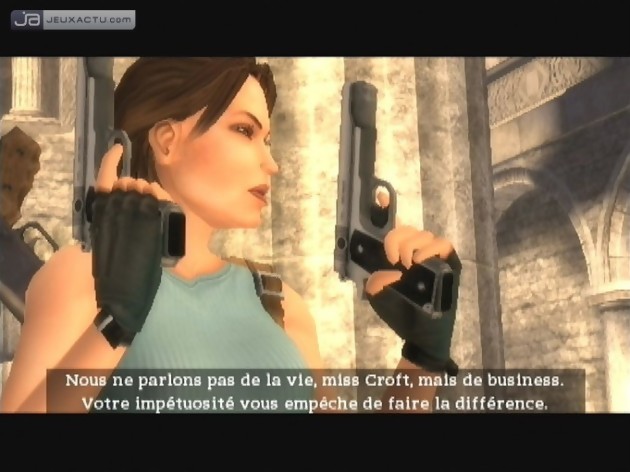 Mais en règle générale, on progresse facilement le pad en main qu’il s’agisse d’explorer les vestiges d’une ancienne civilisation ou lorsqu’il faut trouer la peau d’animaux féroces. Loups, ours, gorilles, pumas et même des dinosaures, le dépaysement est garanti mais on constate, à la différence des adversaires humains, que ce genre d’adversaires n’offre que peu de challenge. Impossible pour eux de crapahuter à votre hauteur, et vous, une fois perché, vous pouvez les arroser tranquillement. Pour palier à ce défaut, les développeurs ont rajouté une jauge de rage qui s’active lorsque vous videz votre chargeur sur une pauvre bête. Cette dernière se met à charger sur vous dans un ultime sursaut d’énergie et il ne vous reste que quelques secondes afin d’éviter le choc et, dans un effet à la Max Payne, d’aligner les deux réticules de visée avant de faire mouche. Une idée intéressante mais qui ne se renouvelle pas suffisamment au gré du bestiaire. Ça, c’est pour les petits avortons que vous croiserez sur votre route. Lorsqu’il s’agit de créatures plus coriaces, le gameplay se scinde en deux parties. La première accompagne une cinématique et à la manière de Shenmue, Fahrenheit et consort, vous devrez tapoter certains boutons au bon moment pour éviter de finir en pâtée pour chiens. Des Quick Time Events qui ne révolutionnent pas le genre mais qui pimentent les quelques cut-scènes du jeu. Mais en règle générale, Tomb Raider Anniversary ne propose pas une difficulté à s’arracher les cheveux. L’ensemble paraît beaucoup trop facile et bien que l’on passe une à une heure et demi pour terminer un niveau en y découvrant les tenants et aboutissants de ses mécanismes, le jeu d’Eidos Interactive possède une bonne durée de vie surtout si vous voulez découvrir tous les secrets de chaque région, déverrouiller les niveaux en contre la montre ou découvrir les bonus du jeu.