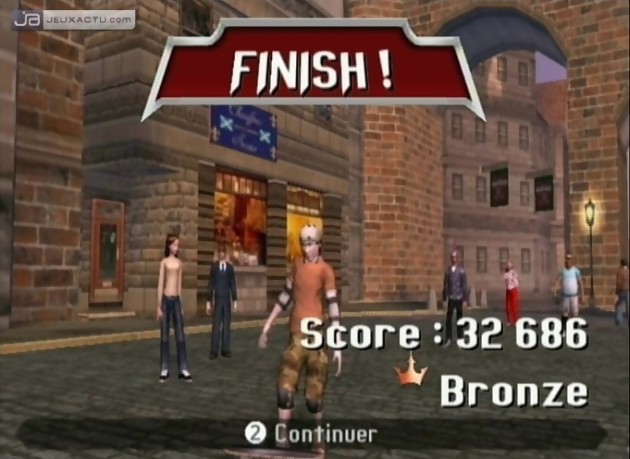 Le premier point en faveur de Tony Hawk's Downhill Jam, c’est qu’il n’est pas compatible avec le Nunchuk. Seule la Wiimote est nécessaire ici, et donc si vous avez acheté Wii Play pour la deuxième manette, les portes du multijoueurs sont ouvertes. Sympathique à deux, le soft devient très vite brouillon lorsqu’on tente le diable avec 4 Wiimotes connectées et un écran splitté en quatre parties. Difficile de jouer dans ces conditions. Mais avant tout chose Tony Hawk's Downhill Jam est une expérience solitaire car en plus des nombreux défis proposés, vous avez une multitude de bonus à débloquer (personnages, niveaux, boards, tenues…) selon vos prouesses sportives. Et c’est le terme approprié au gameplay. Désormais, il va falloir mettre la main à la pâte et ne plus se contenter d’appuyer bêtement sur les boutons. Tout d’abord pour diriger votre personnage, la Wiimote doit être tenue en position horizontale, c’est-à-dire que votre pouce gauche doit être en contact avec la croix multidirectionnelle. En pivotant la télécommande vers la droite ou vers la gauche, vous ferez tourner votre skateur dans la direction souhaitée. A contrario, vous ne procédez pas de la même façon pour gérer votre vitesse. C’est le bouton 2 qui s’en occupe. En appuyant dessus, vous accélérez et lorsqu’il est relâché vous ralentirez votre descente en plus de faire un ollie. Une fois ce principe de base acquis, il est temps de découvrir les tricks, les figures aériennes ou terrestres que vous pouvez effectuer pour doubler votre high score. Juste après un ollie, vous pouvez opter pour les flips, les grabs ou bien mixer les deux possibilités. Ces acrobaties sont disponibles respectivement sur les boutons 1 et 2 tout en donnant une direction avec le D-pad. Si bien évidemment l’ensemble des tricks est moins complet que dans Tony Hawk's Project 8, il est amplement suffisant pour remplir votre jauge d’os. Kézako ? A l’image des autres épisodes estampillés Tony Hawk, plus vous réalisez de figures, plus vous remplissez une jauge qui, une fois pleine, vous octroie une pointe de vitesse ahurissante que vous activerez en secouant rapidement la Wiimote vers le bas. Parallèlement à cette jauge, une icône « spécial » fait son apparition à l’écran pour un trick de folie en appuyant sur A une fois en l’air.