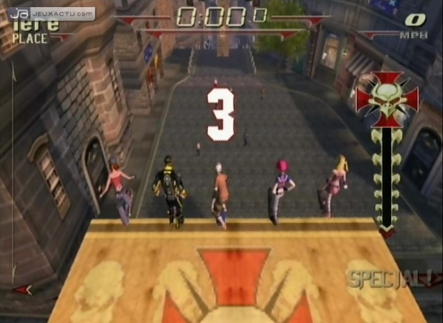 Douze personnages vous attendent dans Tony Hawk's Downhill Jam. Et parmi cette douzaine, seul Tony Hawk joue les stars. Les autres font offices d’illustres inconnus venus des quatre coins du globe pour ravir la première place dans cette compétition unique en son genre. Bien évidemment, vous avez la possibilité de créer votre propre avatar en choisissant soigneusement sa tenue vestimentaire, sa coupe de cheveux, ses tatouages, ses protections (coudières, casque ou genouillères) afin d’en faire un sportif à votre image. Le but du jeu de Tony Hawk's Downhill Jam est de descendre le plus rapidement possible d’un point A à un point B sans jamais tomber de votre skate. Dis comme ça, ça ressemblerait à n’importe quel jeu de courses, que vous soyez en bagnoles, en motos ou à dos d’ornithorynque. Mais la particularité de Tony Hawk's Downhill Jam est de mélanger ce genre de jeu à l’univers du skate avec ses paysages tous plus loufoques les uns que les autres. De San Francisco au Machu Pichu en passant par Hong-Kong, Edinburgh, Rio de Janeiro ou encore les Alpes, comme on dit les voyages forment la jeunesse et vous allez être servi d’autant plus que le jeu d’Activision propose un grand nombre de challenges à réussir pour devenir le nouveau numéro 1 mondial. C’est en enchaînant les victoires que vous grimperez de niveau mais au fur et à mesure de votre progression, les adversaires gagneront en ténacité et les objectifs à atteindre se corseront avec le temps. C’est ainsi qu’en plus de devoir dévaler les pentes des différentes villes, vous devrez glaner un maximum de points en trickant comme un fou. Parfois même, vous concourrez tout seul contre le temps en passant par des checkpoints bonus rajoutant quelques secondes au chronomètre ou au contraire vous devrez détruire tout sur votre passage en un minimum de temps. Finalement la descente sur une planche à roulette devient beaucoup plus intense qu’il n’y paraît. Reste à découvrir le gameplay qui peut aussi bien embellir l’intérêt du jeu que le réduire à néant en cas de mauvaise configuration comme ce que l’on a pu voir sur Call of Duty 3 : En Marche vers Paris, toujours chez Activision.