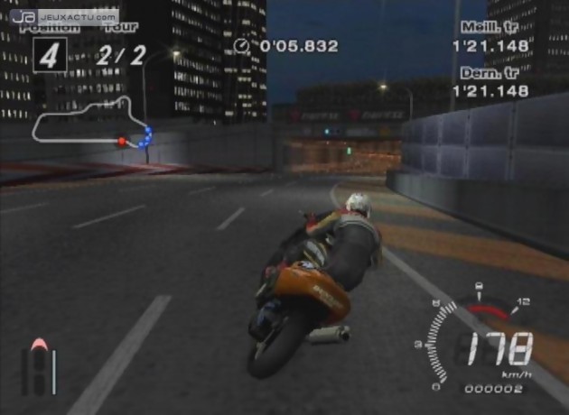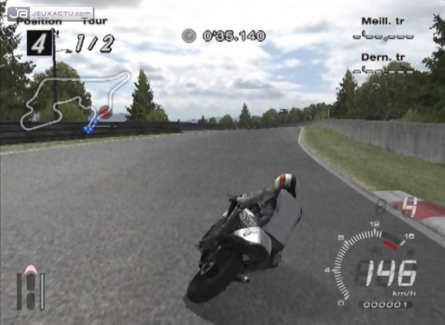 Enchaînons nos péripéties désormais avec le mode "Tourist Trophy". Là non plus, pas de surprise, on reste en terrain connu. "Permis", "Garage", "Courses" et mode "Photo" – qui permet notamment de sauvegarder sur votre clé USB des clichés des courses et de les imprimer – ou encore constructeurs. Les licences passent toutefois au nombre de quatre et semblent un petit peu moins élitistes qu'auparavant même si les novices souffriront certainement quelques heures sur les dernières épreuves. Bien sûr, pour faciliter l'apprentissage de ces derniers, on retrouve évidemment les fameux marqueurs au sol. Petit désagrément : le passage à l'étape supérieure ne se fait pas automatiquement après remporté une étape et il faut donc passer par le menu principal. Rien de bien méchant toutefois. Quant au reste, la petite subtilité est que toute notion d'argent a disparu. Plus besoin de s'acharner sur une bourrique sur les mêmes championnats pour pouvoir s'offrir le bolide de ses rêves ou ne serait-ce que l'équiper. L'équiper ? Ah non, ce n'est plus possible ici d'ailleurs et les réglages avant la course sont vraiment minimalistes. Voilà tout un pan entier du système de jeu de Gran Turismo 4 qui est amputé ici alors qu'il s'agissait d'une des plus grandes richesses du titre. Alors comment débloquer les fameuses motos ? Par le mérite tout simplement. Sur le papier, cela semble bien beau mais dans concrètement, cela se passe comment ? Comme on pouvait s'y attendre également, on démarre un peu sur des chapeaux de roues avec un simple scooter dont ne voudrait probablement pas un livreur de pizza. Les 10 plus prestigieux constructeurs (Yamaha, Honda, Kawasaki, Suzuki, Aprilia, BMW, etc.) se sont alors donnés rendez-vous pour présenter une sélection de leur catalogue, soit entre 2 et une vingtaine de véhicule de course pour chacun (ce qui nous fait 125 motos à débloquer au total). Ainsi, si une moto attire votre attention, vous pourrez alors la gagner en remportant un défi. Il va sans dire bien sûr qu'il y autant de challenges que de motos en jeu mais on regrettera que ces derniers manquent un peu de variété. En effet, il s'agit principalement de dépasser et de tenir tête à son adversaire durant une dizaine de secondes ou de remporter la course.