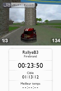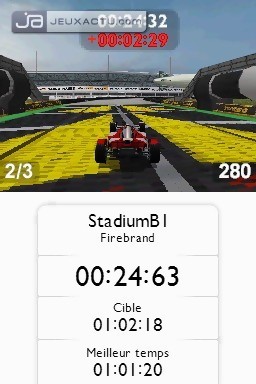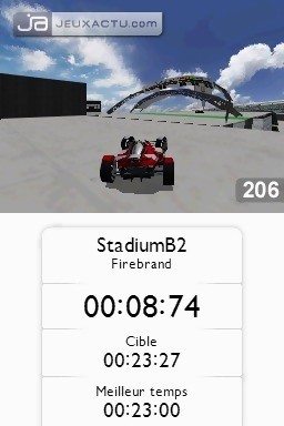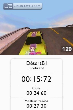 Contrairement aux autres jeux de course classiques, TrackMania DS ne s’attarde pas sur les graphismes, évidemment très en retrait par rapport à ce qu’on peut voir sur d’autres consoles, bien que la comparaison soit dispensable. Cela dit, sans être moche, TrackMania DS fait partie des jeux de course les plus soignés de la machine. Pas de textures grossières, ni de pixels qui nous explosent à la gueule et encore moins des contours trop cubiques, le titre s’en sort plutôt pas mal. Mais c’est surtout du côté de la vitesse d’animation que les développeurs de Firebrand Games sont parvenus à faire des miracles. Généralement fades et ne provoquant aucune sensation, les jeux de caisse sur DS n’ont que rarement brillé en matière de fluidité. Ce n’est pas le cas ici et ceux pour qui l’impression de vitesse prime avant tout dans un jeu de course – et on les comprendra aisément – peuvent être rassurés, TrackMania DS tient la dragée haute, quelque soit le type de course ou d’environnement. A ce sujet, sachez que TrackMania DS reprend trois des sept environnements regroupés dans TrackMania United, à savoir "Stadium", "Désert" et "Rally". Evidemment, ces trois lieux distincts sont découpés en plusieurs tracés différents, souvent sinueux et qui n’autorisent aucune fausse manœuvre, sous peine de devoir recommencer depuis le départ. C’est ça aussi TrackMania DS, la progression par l’échec, une approche très hardcore qui ne séduira pas tout un chacun, c’est une certitude. Ce n’est d’ailleurs pas un hasard si la touche Y a pour vocation de renvoyer le bolide sur la ligne d’arrivée. A l’instar des moutures PC, seul le chrono compte. Peu importe la position, peu importe les concurrents (il n’y a aucune gestion des collisions, c’est tout à fait "normal"), l’objectif unique et ultime est de réaliser le meilleur temps. Etre en tension permanente, voilà le genre de stress qui ne plaira pas à tout le monde et on regrette quelque part que les concepteurs n’aient pas pensé à une version course classique, histoire de s’ouvrir à un plus large public. Tant pis.