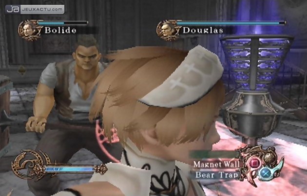 Loin des poupées virtuelles de Dead or Alive et des visions d’horreur de Project Zero, Tecmo achevait pendant l’été 2005 un nouvel épisode de la série Deception, saga totalement inconnue dans l’Hexagone, mais suffisamment appréciée chez nos amis nippons pour en faire une suite sur PlayStation 2. Tecmo a conservé les ingrédients qui ont fait la renommée de sa licence puisqu’il s’agira une fois de plus de truffer les bâtisses de pièges divers et variés afin de faire fuir les intrus par la violence. Dans Trapt, c’est Allura ou plutôt Alicia - c’est son prénom original - qui se chargera de la manutention. Pas vraiment enviable, son dur labeur reste néanmoins bien plus appréciable que le sort qui l’attendait, à savoir la peine de mort. Accusée par sa propre mère d’avoir tué son père le roi, Allura décide de s’exiler avec son amie Rachel dans les pièces du manoir familial. Ce qu’elle pensait être un havre de paix s’est vite transformé en un lieu de pèlerinage où tout un chacun s’est donné rendez-vous pour apercevoir la malédiction qui frappe la frêle jeune fille. Lorsque le miracle a lieu, les invités surprise sont aussitôt chassés par notre héroïne visiblement pas prête de rejoindre le monde des morts. Aussi étrange que le scénario, le gameplay de Trapt tranche radicalement avec ce qu’on a l’habitude de nous servir. N’arrivant visiblement pas à se servir d’une arme et encore moins d’utiliser ses poings ou de lever la jambe pour combattre ses ennemis, Allura possède néanmoins le don de créer des pièges aussi utiles que saugrenues. Pour ce faire, on accède à un plan grillagé de la pièce où l’on se trouve afin d’y placer ses propres pièges. Fléchettes, bombes, mur coulissant, champ électrique, tous les artifices sont bons pour éviter de périr sous les attaques des assaillants. En anticipant les mouvements de ces derniers, Allura peut ainsi mettre en route le mécanisme de ses pièges pour infliger un maximum de dégâts. En sus de ses attrapes-nigauds de pacotille, Allura peut également déclencher d’autres guet-apens déjà en place dans le manoir. Aussi rafraîchissant soit-il les 30 premières minutes, le gameplay de Trapt avoue très rapidement ses limites, la faute à une répétitivité des actions abrutissantes et à un intérêt qui frise le zéro absolu. Malheureusement, Tecmo ne pourra pas miser sur la plastique de ses personnages pour faire passer la pilule puisque Trapt est tout simplement à des années-lumière de ce qu’on peut trouver sur PS2 à l’heure actuelle. Non content d’exhiber une réalisation d’un autre âge, le titre peut également se targuer de proposer des personnages qui se déplacent avec une lenteur jamais égalée. Le joueur passe son temps à courir d’une pièce à une autre en espérant que les voyous de passage circuleront aux alentours des embuscades soigneusement disposés dans le château. L’ennui atteindra son paroxysme lors des innombrables cinématiques dénuées de tout intérêt et des interminables temps de chargement. Avant même de succomber à l’envie de piéger sa console, une simple pression suffira pour se libérer de ce mauvais guêpier.