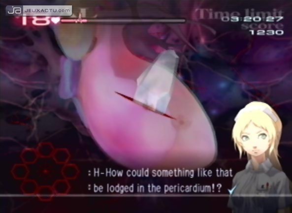 Après une courte période d’adaptation, vous pourrez vous prendre pour un virtuose du bistouri capable de faire des miracles avec une facilité déconcertante. Que les moins habiles se rassurent, un autre changement dans Trauma Center : Second Opinion réside dans le fait qu’il est désormais possible d’évoluer à son rythme et de diminuer les échecs sur certaines opérations grâce à la possibilité de choisir entre trois niveaux de difficulté – faible, normal ou difficile – et ce, pour chaque mission. Grâce à cette nouvelle option, vous vous éviterez une surtension et épargnerez à vos piles une vie trop éphémère. Atlus a bien soigné l’entrée de la série sur la Wii avec une optimisation des différentes actions du jeu, qui nous permet de profiter des capacités que nous offre la combinaison de la Wiimote et du Nunchuk. Ce lifting se remarque sur les instruments utilisés. Le traditionnel massage cardiaque a été remplacé par le défibrilateur où l’utilisation des deux mains est requise. Egalement, le faisceau lumineux de Nozomi sera bien utile pour éclairer les zones d’ombre. Il est aussi agréable de constater que la mission de désamorçage de la bombe a été complètement remaniée. Plus besoin de faire des cercles pour tourner des vis, il suffit désormais de mimer le tournevis en tournant la Wiimote. La simulation en devient presque palpable.