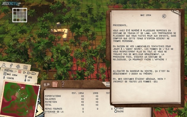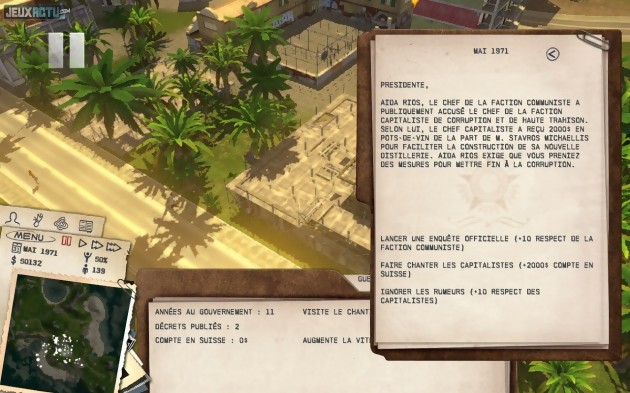Malgré des objectifs qui varient d’un niveau à l’autre, le mode campagne ressemble donc à un éternel recommencement. Tout reprendre à zéro est d’autant plus ennuyeux que l’interface est imparfaite. Recette habituelle, vous sélectionnez dans un menu – assez grossier et pas toujours réactif – le bâtiment que vous souhaitez construire, puis le positionnez où bon vous semble sur la carte. Problème, vous ne disposez d’aucun outil de terraformation, et si le sol n’est pas à peu près plan, vous devrez choisir un autre site. Le même souci se pose avec les routes, que vous devez tracer en luttant continuellement contre l’ordinateur, qui vous reproche systématiquement des angles trop forts, des dénivelés trop importants, et ignore la notion même de pont ou de tunnel. La circulation entre les différents points de votre île, généralement barrée de quelques beaux reliefs, est donc longue est difficile, et mieux vaut organiser l’espace afin que industries et logements soient proches les uns des autres, ce qui n’est pas toujours simple. Ces défauts de prise en main éloignent Tropico 3 de son public. A priori destiné aux joueurs occasionnels, qui apprécient les city-builders sans avoir pour autant passé des milliers d’heures sur les Sim City & consorts, le titre d’Haemimont Games se retrouve à nager entre deux eaux. D’un côté, la palette limitée de bâtiments, l’impossibilité de réellement personnaliser l’aventure et des indicateurs statistiques peu complets et pas bien clairs éloigneront les puristes. De l’autre, l’interface pas toujours pratique, le rythme mou de la partie et le mix – intéressant et plutôt riche – entre micro et macro management, gestion économique et exercice du pouvoir, rebuteront les débutants. Les deux publics pourront néanmoins trouver matière à s’amuser, s’ils consentent à faire quelques sacrifices. Très joli, doté d’une bande-son latino du meilleur goût et d’un doublage français rigolo, Tropico 3 bénéficie toujours du ton joyeusement politiquement incorrect qui a fait le charme de la série. Le titre propose tout un tas d’options assez délirantes vous permettant de vous assurer de lendemains meilleurs, depuis l’organisation de petits "accidents" visant les principaux opposants jusqu’au détournement de fonds via des banques spéciales. Une grève ? Soudoyez les meneurs ou envoyez l’armée les massacrer. Une élection à l’issue incertaine ? Achetez le vote de certains électeurs ou décrétez la loi martiale. Des possibilités rarement proposées par les jeux du genre qui peuvent, à elles seules, justifier d’une escale à Tropico. N’espérez toutefois pas y passer vos vacances : comme dans la vraie vie, après quelques heures sur un îlot, on s’ennuie…